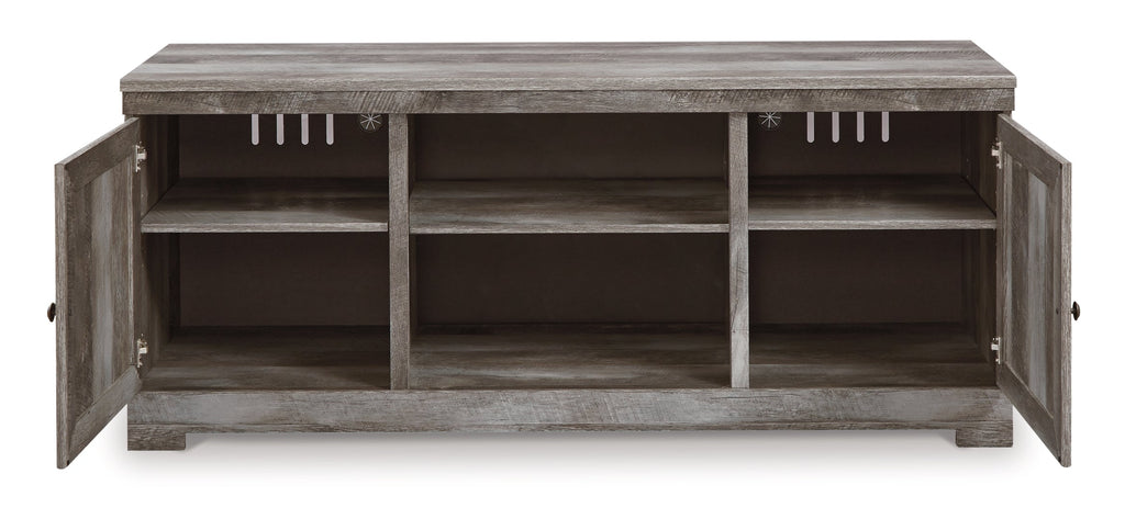 - TV stand with 2 storage cabinets (each with an adjustable shelf) and removable/adjustable center shelf