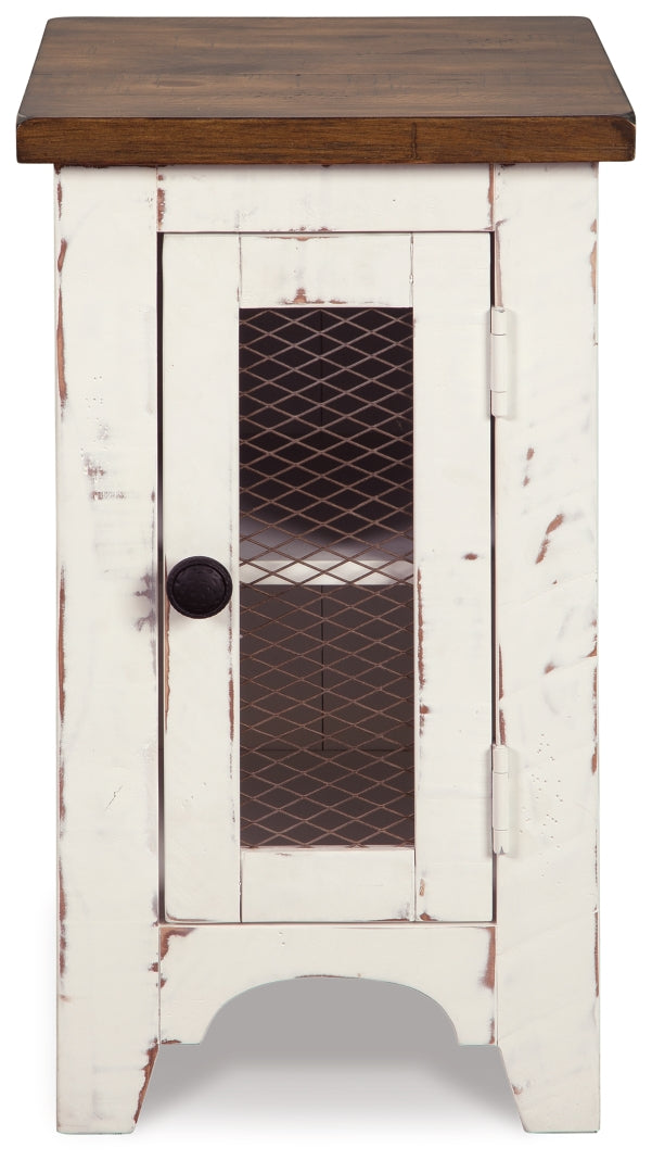 Double take. Sporting a two-tone finish that pairs a distressed vintage white with aged natural pine color, this chairside end table elevates the art of rustic farmhouse living. Enhancing its charm: shelved storage visible through the cabinet door with inset metal grill.