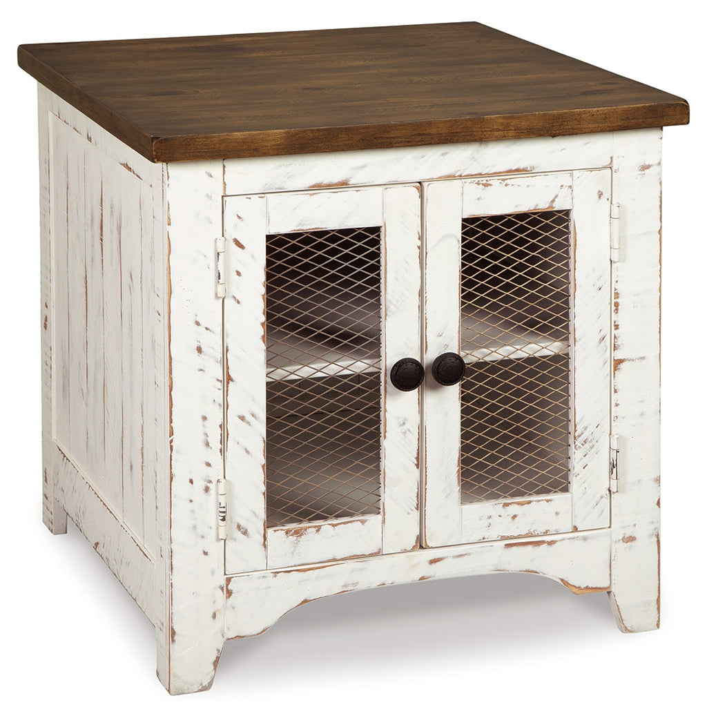 Double take. Sporting a two-tone finish that pairs a distressed vintage white with aged natural pine color, this occasional table set elevates the art of rustic farmhouse living. Enhancing its charm: a storage coffee table with two-sided lift and a cabinet/end table with classic inset metal grills.