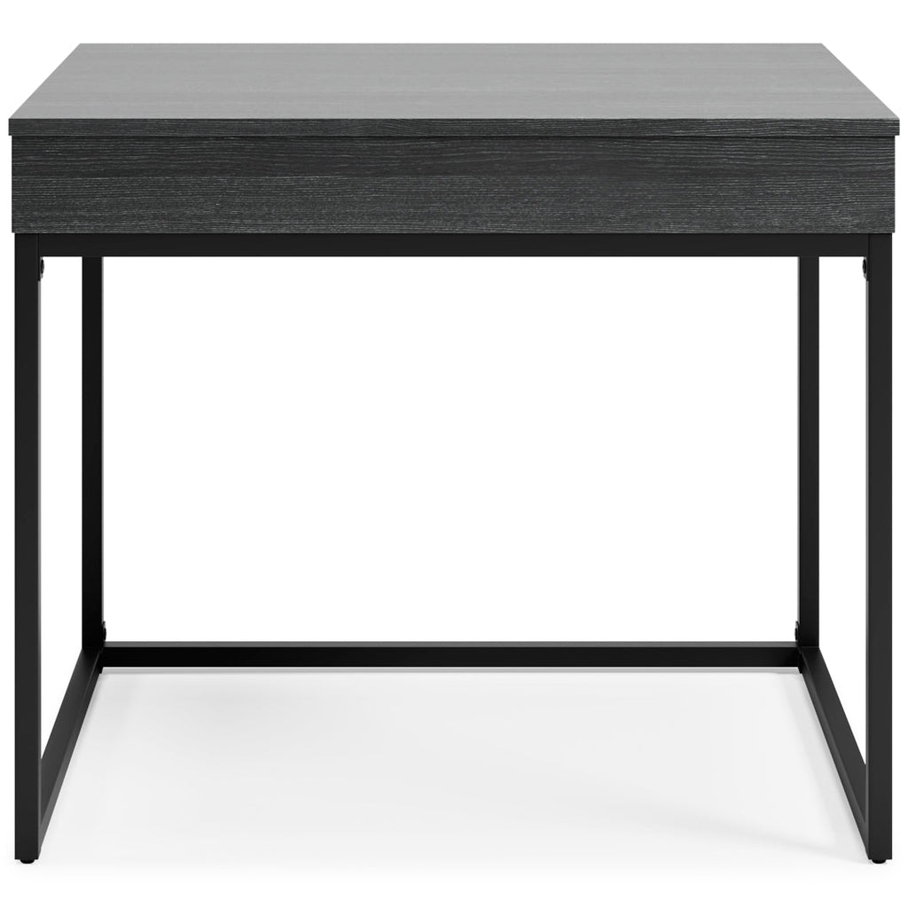 Elevate your home office with this simply sensational lift-top desk. Pairing a dark wood grain look with a black metal base for modern appeal, this minimalistic desk is dressed to impress in a no-muss, no-fuss way. Small storage bins underneath the sleek lift top bring added function.