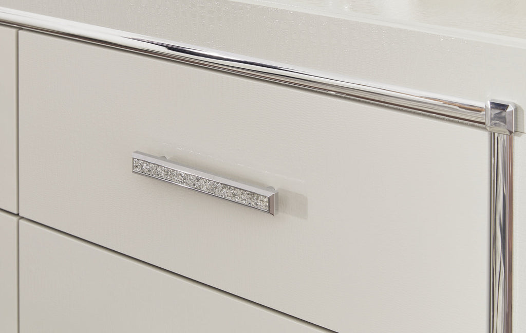 Bright, bold luxury. This chest of drawers dazzles with its attention to detail. Your love of glamorous style is reflected in its all-over faux gator in a metallic finish, exquisitely paired with faceted chrome-tone details. Complete with smooth-gliding storage drawers, it inspires you to live luxuriously every day—whether dressing up to go out or dressing down to stay in.