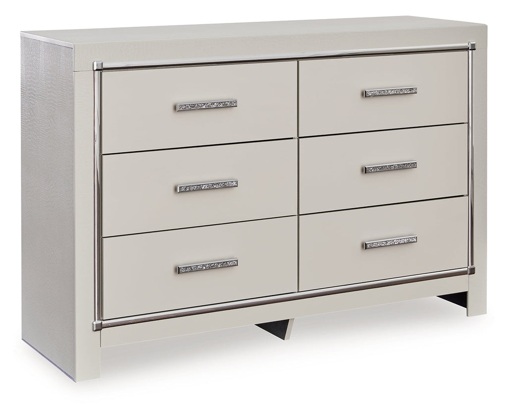 Bright, bold luxury. This dresser dazzles with its attention to detail. Your love of glamorous style is reflected in its all-over faux gator pattern in a metallic finish, exquisitely paired with faceted chrome-tone details. Complete with smooth-gliding storage drawers, it inspires you to live luxuriously every day—whether dressing up to go out or dressing down to stay in.