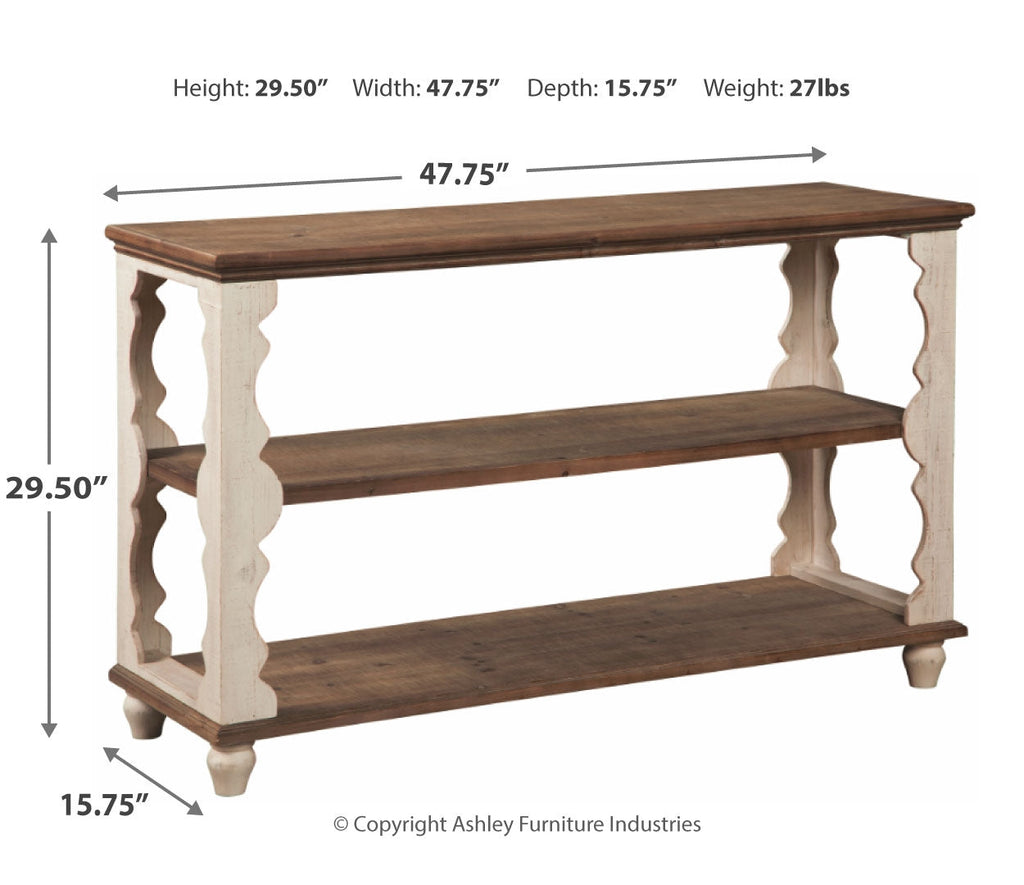 Simply put, this console sofa table is minimalism with maximum charm. Naturally finished knotty wood combined with antiqued white is an artful combination. But what really makes this console sofa table so spectacular: scalloped woodwork you just don’t see every day.