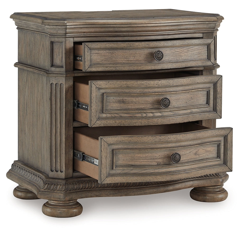 Merging traditional elegance with contemporary comfort, this nightstand takes your bedroom retreat to the next level. Serpentine curves, ash swirl veneer inlays on the top and a glazed antiqued-look finish radiate timeless sophistication. Drawers are packed with ample bedside storage possibilities. A convenient 110V power supply and USB charging add a modern touch to this stunningly refined piece.