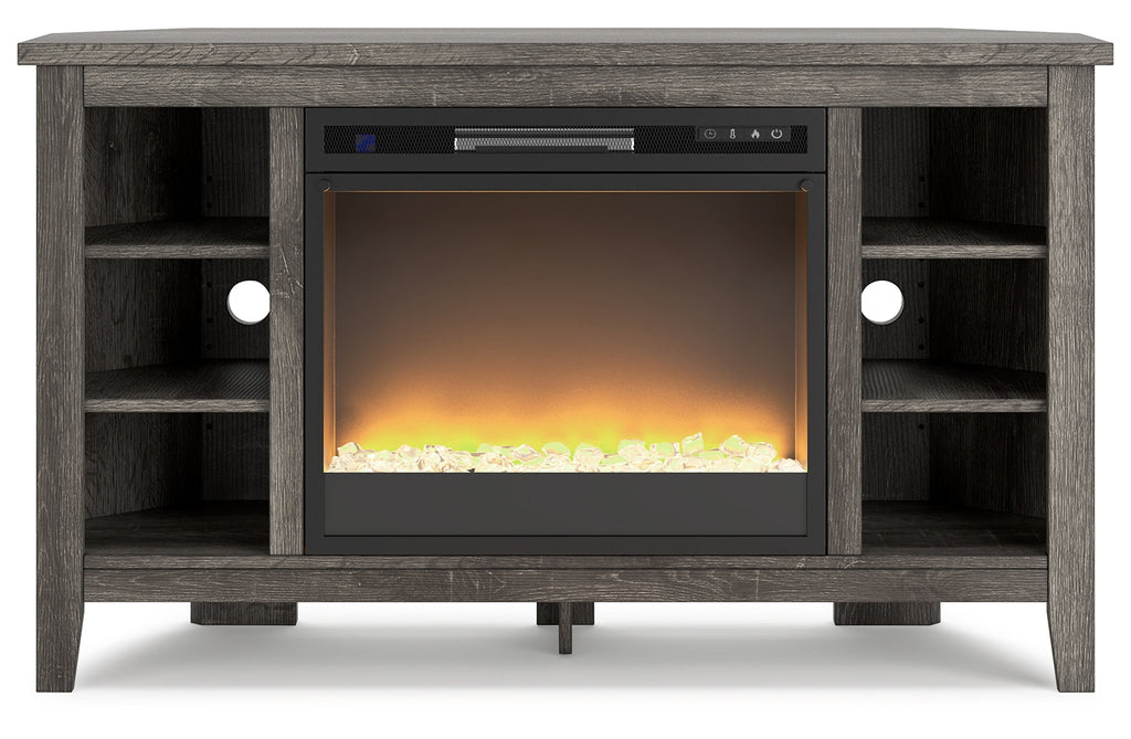 With its replicated weathered oak finish and minimalist charm, this TV stand with electric fireplace insert is right in tune with your relaxed approach to high style. Beautifully made to accommodate your media equipment, it’s well equipped with adjustable shelving, cutouts for wire management and a pair of glass-front doors that enhance the clean-lined aesthetic. The look is ideal for modern farmhouse and contemporary settings. Adding that much more show-stopping style, the electric fireplace insert operates with or without heat and includes a six-level temperature setting, a remote control and an overheating control for added safety. It comes with faux glass crystals and natural stones, so you can customize the look of the flame bed.