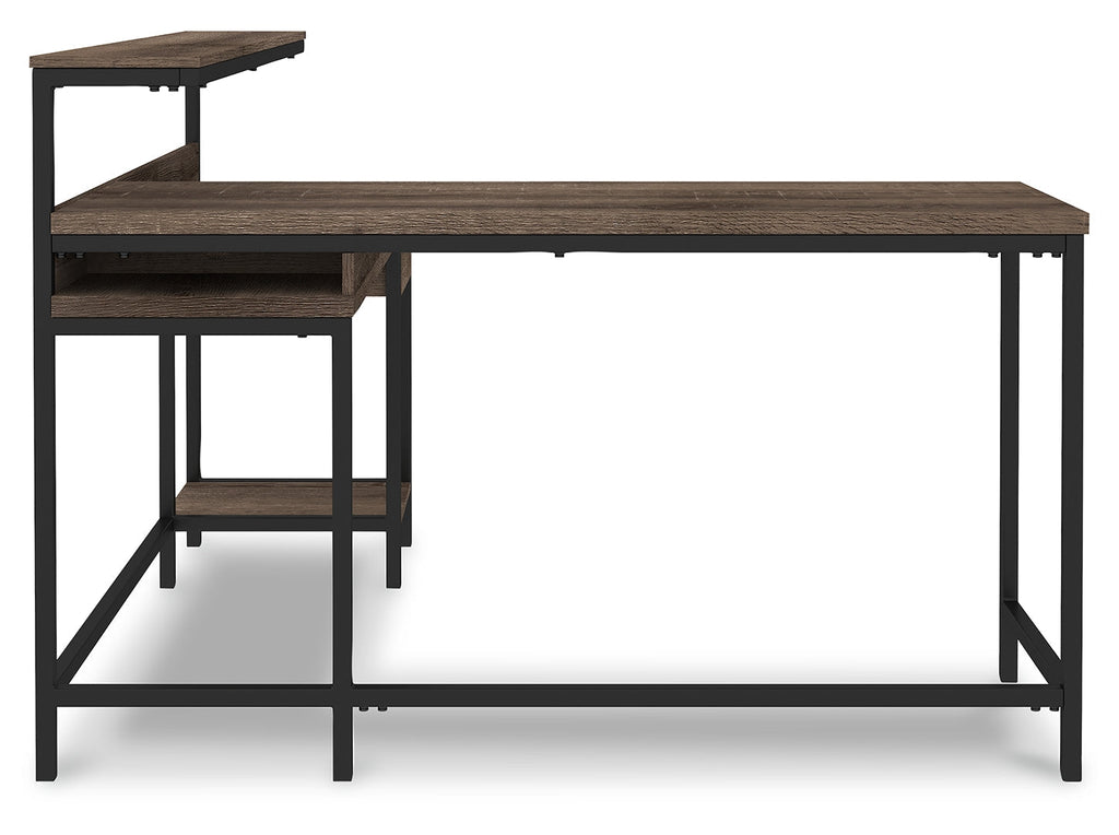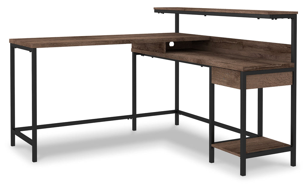 - L-desk includes desk with drawer and shelf, hutch with display shelf and return
