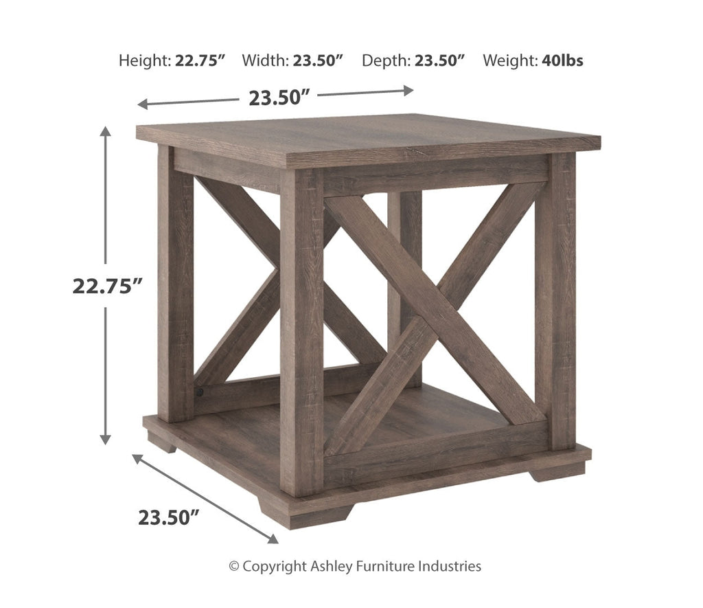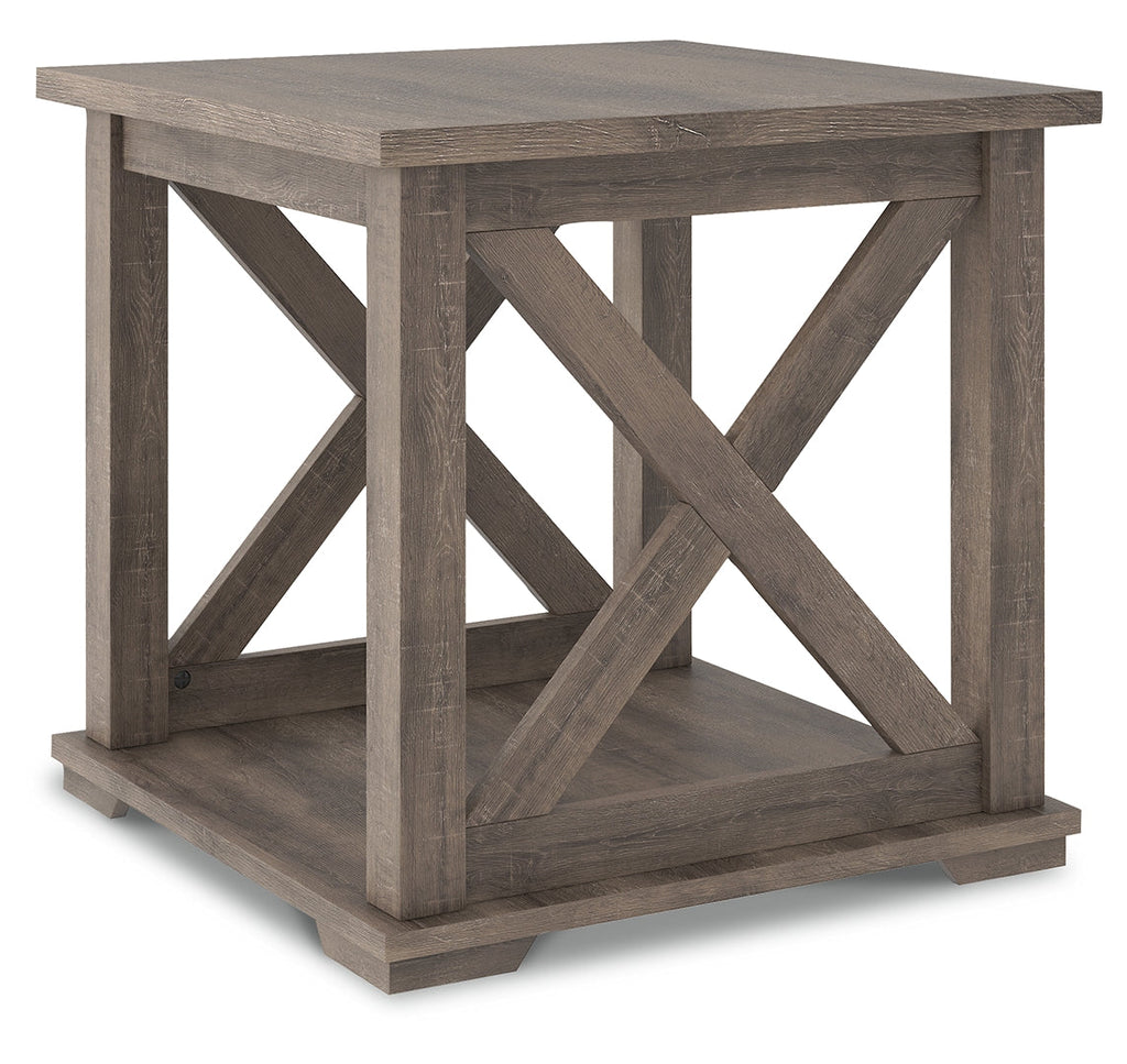 Raise the bar on modern farmhouse design with this essential end table. Sporting a handsome weathered oak effect and cross buck design, this table makes a statement wherever it lands. With its generous shelved storage space, this home essential is packed with possibilities.