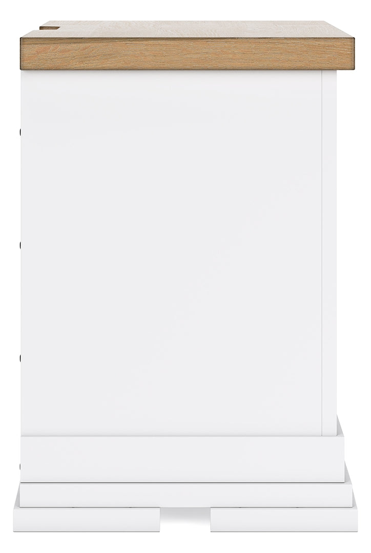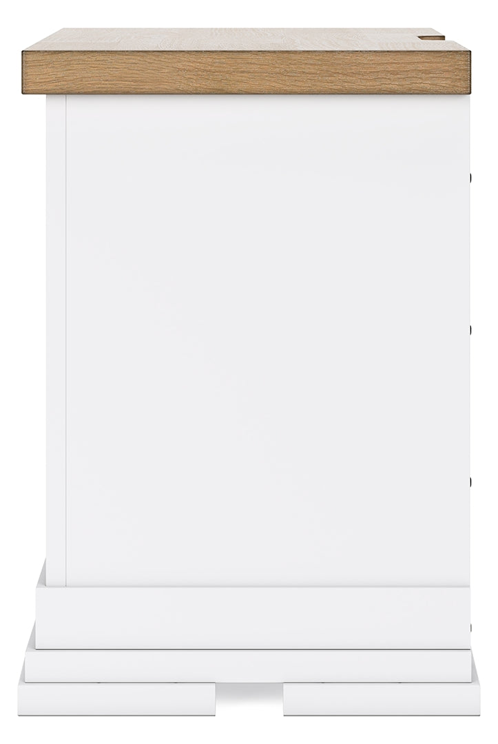 Casual style with substance. This two-tone nightstand raises the bar on comfortably cozy design in your soothing sanctuary. A sturdy silhouette with a classic white finish and black metal hardware exudes modern farmhouse vibes. The butcher block oak veneer top adds a relaxed aesthetic. And bedside charging for your go-to devices is made easy with power outlets and USB ports.
