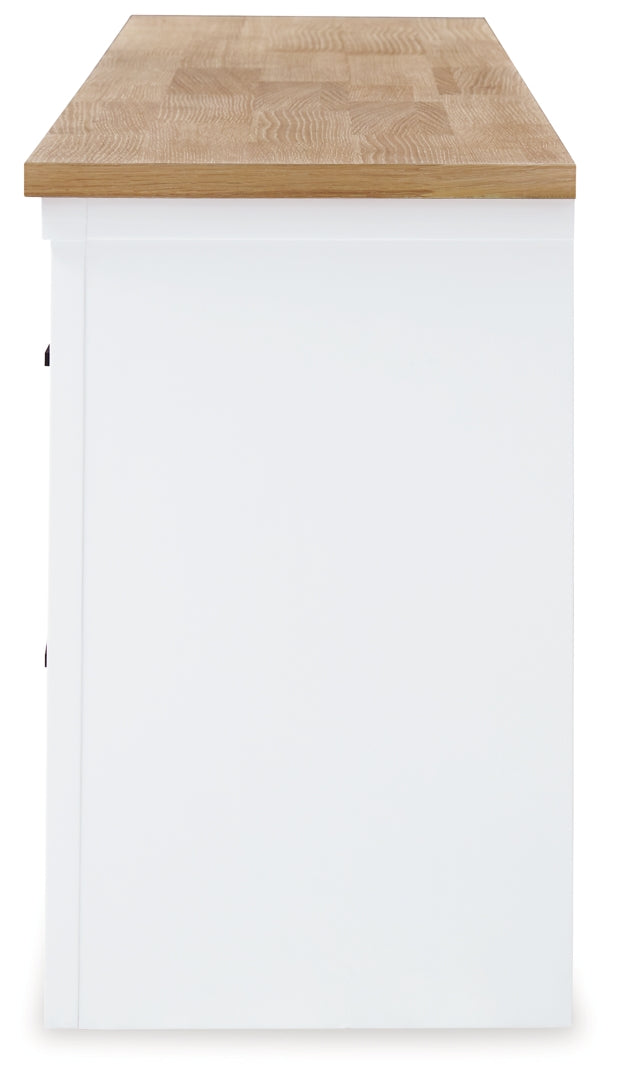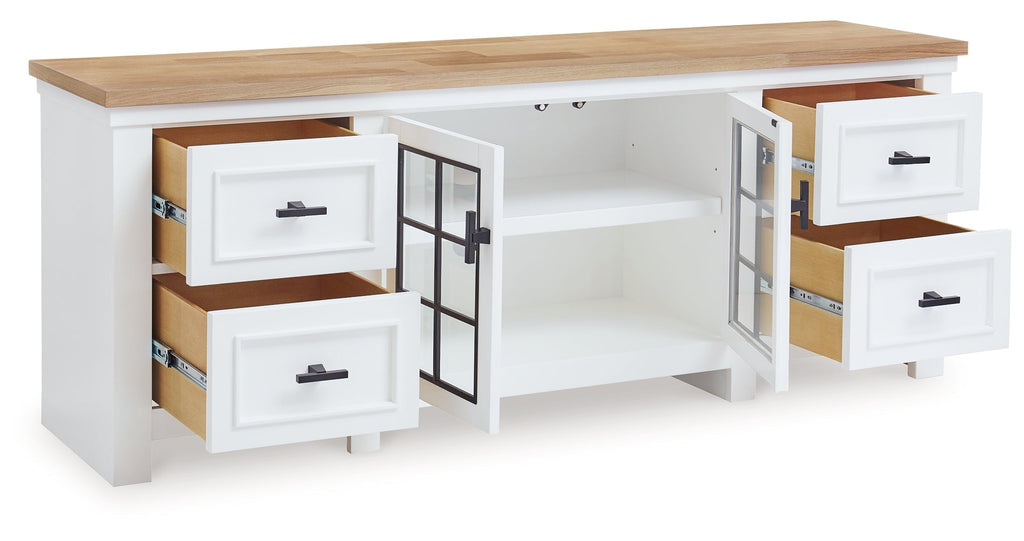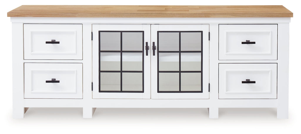 Casual style with substance. This two-tone TV stand raises the bar on comfortably cozy design. A sturdy silhouette with a butcher block oak veneer top, classic white finish and contemporary black metal hardware exudes modern farmhouse vibes. The spacious cabinet, display shelves and drawers let you tuck away entertainment essentials while displaying treasures in this charmingly curated piece. Cutouts for wire management help keep the look relaxed and uncluttered.