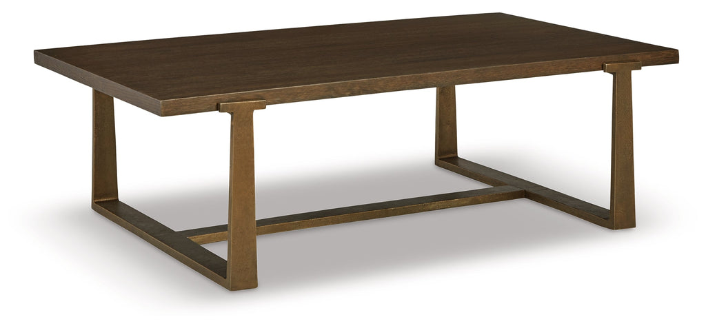 Chic and sleek, this coffee table satisfies your taste for contemporary design. Its warm brown top is neutral and refined, while the antiqued goldtone base adds textural character. Place your favorite decorative accents on top to transform your living room into a curated modern masterpiece.
