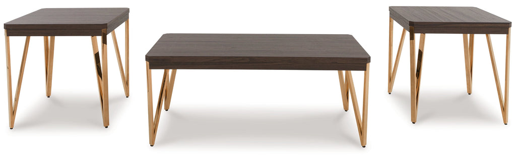 Nothing but the bare essentials here. Combining contemporary styling with a modern vibe, this table set accentuates your sofa or loveseat in the simplest way. A warm goldtone metal frame and rich dark wood-tone tabletop exemplify minimalist sophistication. Anchor your living room furnishings with this stunning statement.