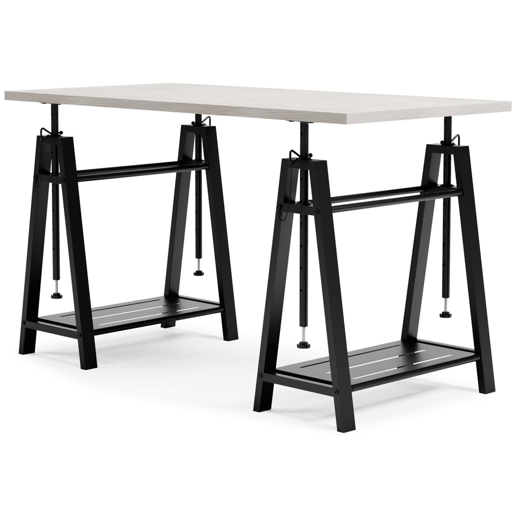 Love an urban farmhouse aesthetic? Make it work to your advantage with this beautifully styled home office desk. A simply striking choice in home office furniture, it has an unmistakable farmhouse feel thanks to design elements including a whitewashed finish and gunmetal accents, this sawhorse adjustable height desk is right on trend. Whether you're sitting, standing, typing or crafting, you're sure to love the sawhorse desk's unique 8-level adjustable height feature.
