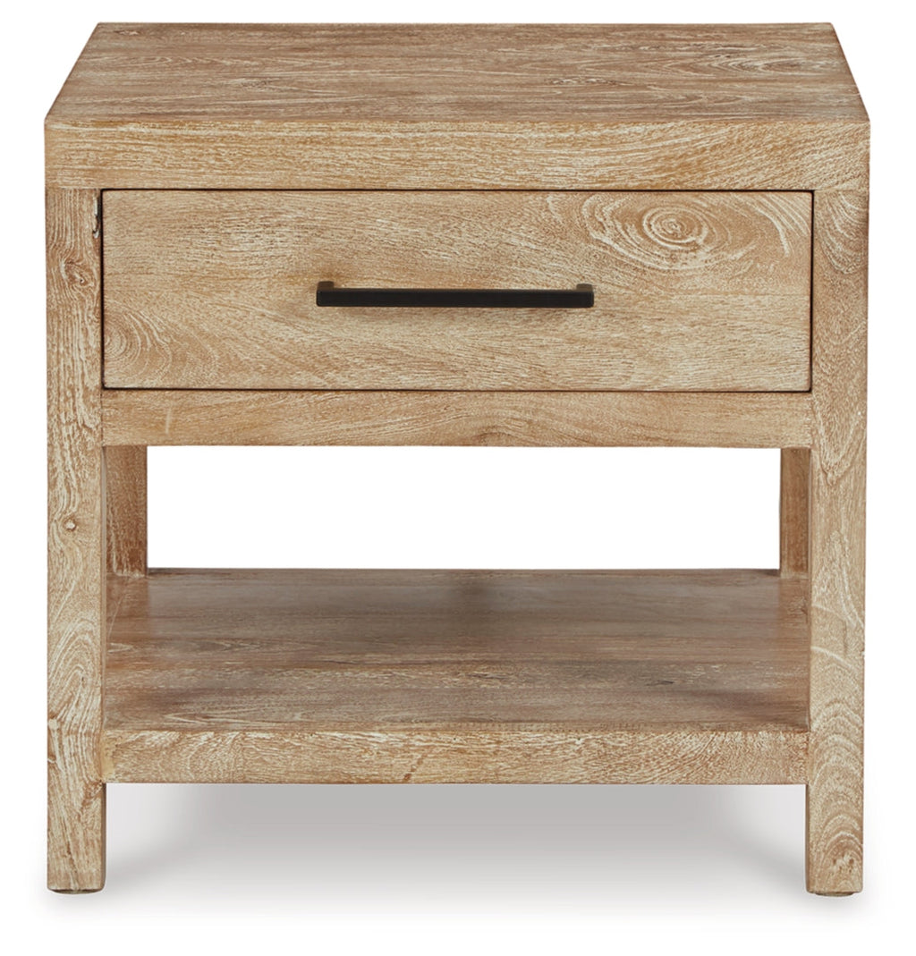 Make life simple in style with this square end table. Its classic geometric construction gets a bit of flair with a hand-applied whitewash finish that accentuates the natural wood grain. If you love a clutter-free tabletop, you’ll surely appreciate the smooth-gliding drawer—perfect for remotes, magazines and more. Those with an eye for naturally beautiful design will love this wood table's understated sensibility.