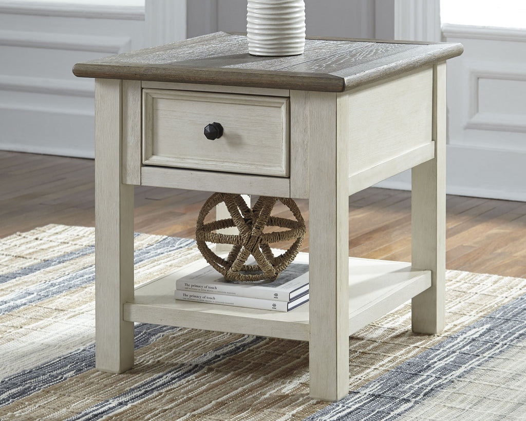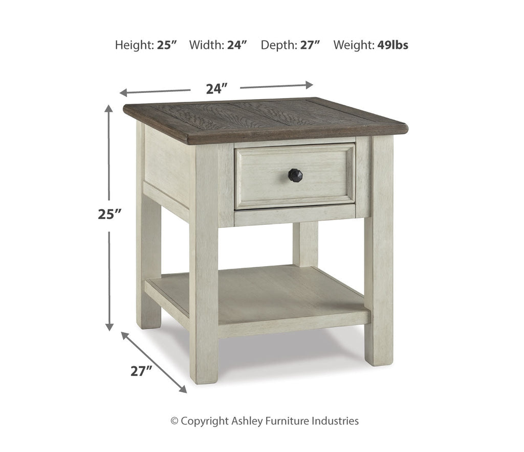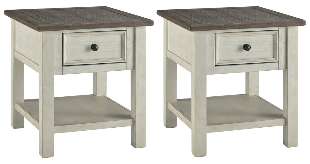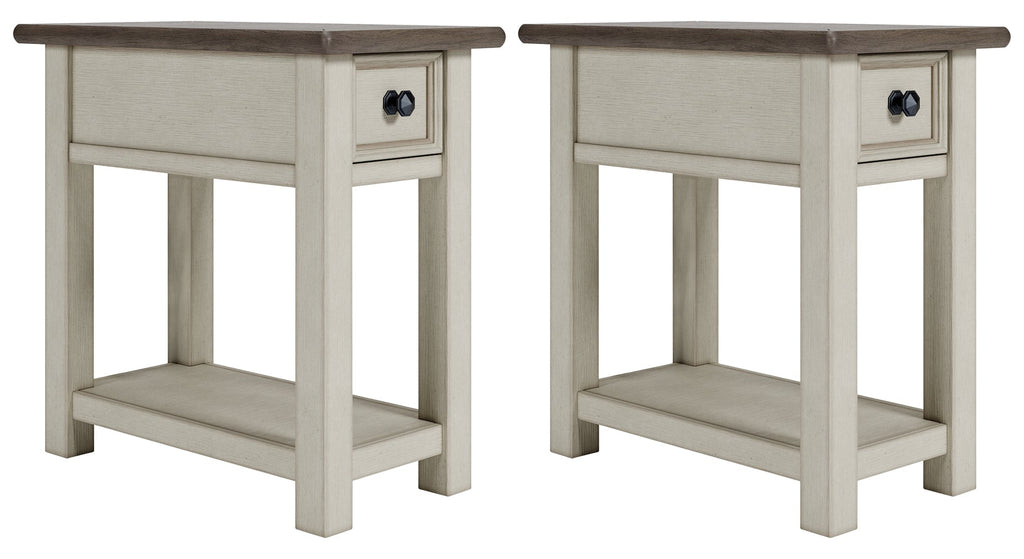 Whether your style is farmhouse fresh, shabby chic or country cottage, you’ll find this chairside end table set dressed to impress. Its two-tone finish pairs weathered oak with antique white for that much more quaint character. Charming elements include a plank-and-frame style top, black faceted hardware and a smooth-gliding drawer for remote controls and more. Integrated power supply with USB charging is ideal for keeping your personal devices at the ready.