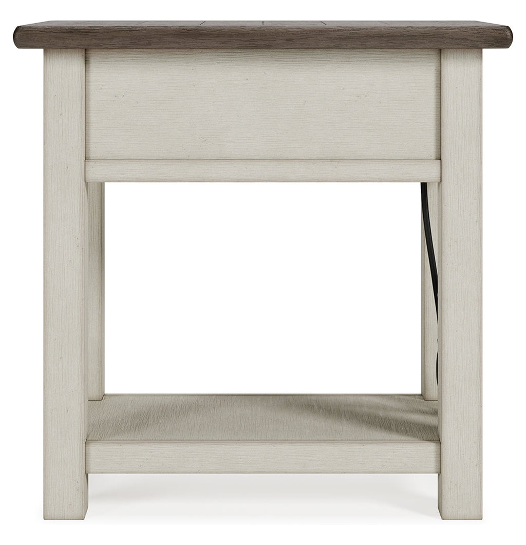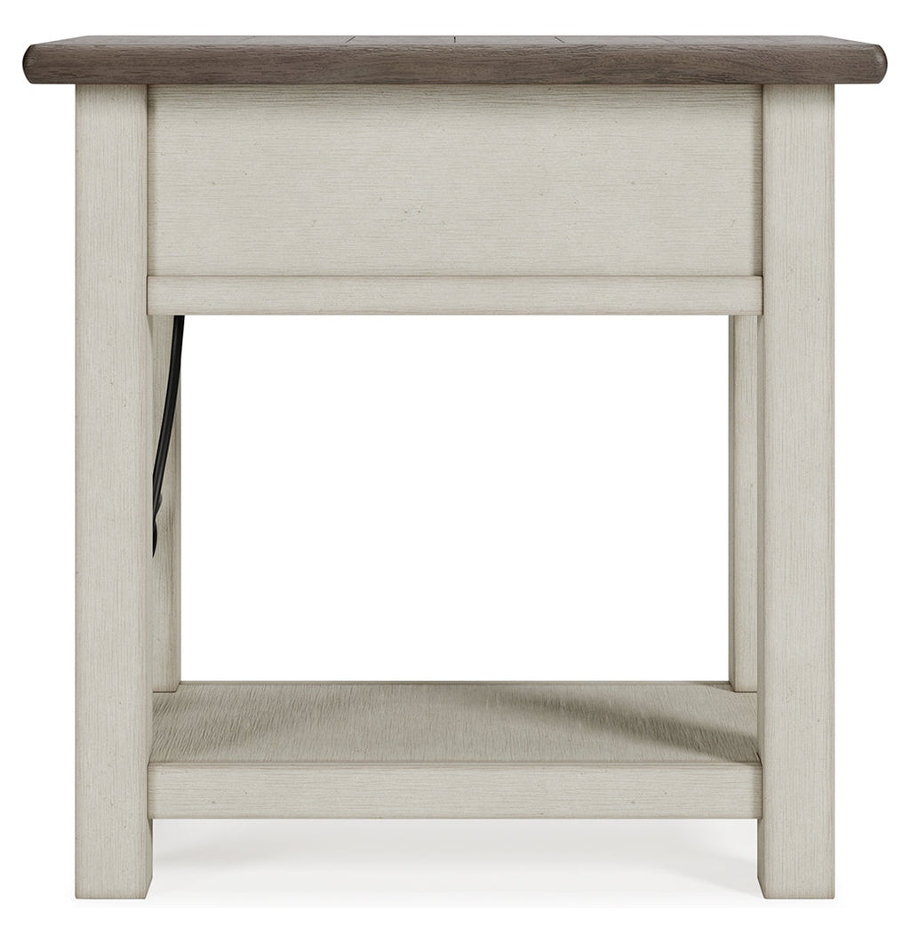 Whether your style is farmhouse fresh, shabby chic or country cottage, you’ll find this chairside end table dressed to impress. Its two-tone finish pairs weathered oak with antique white for that much more quaint character. Charming elements include a plank-and-frame style top, black faceted hardware and a smooth-gliding drawer for remote controls and more. Integrated power supply with dual USB charging ports is ideal for keeping your personal devices at the ready.