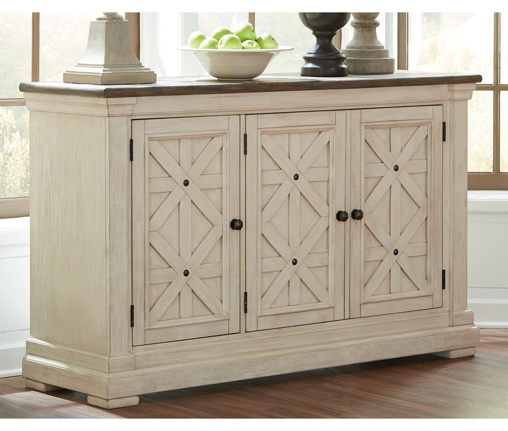 Need a stylish space to store dinnerware and all your dining room essentials? This server is a dream come true with two adjustable shelves that offer large capacity and a spacious top that's perfect for setting a buffet. Embellished with the casual appeal of three latticed doors, an attractive planked top with weathered oak finish and a lightly distressed white finish throughout, this vintage look will serve up elegance for years to come.