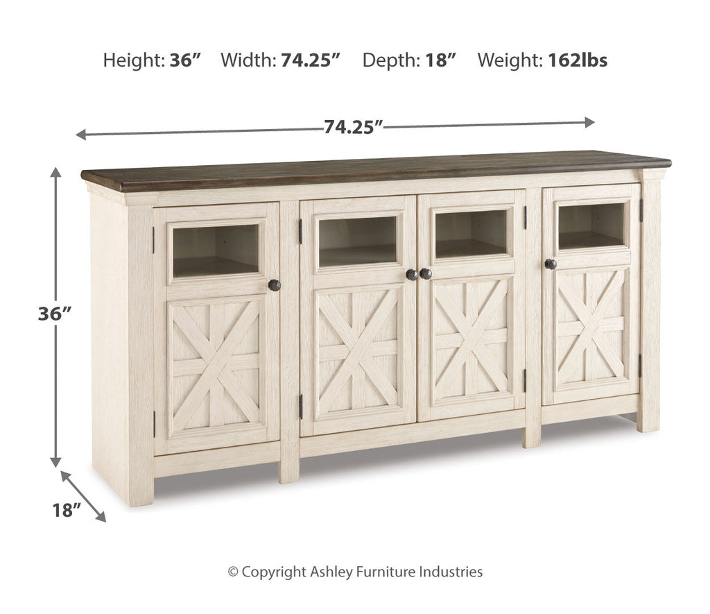 Whether your style is farmhouse fresh, shabby chic or country cottage, you’ll find this extra large TV stand perfectly in tune. Its two-tone, gently distressed finish pairs weathered oak with antiqued white for that much more quaint character. Charming elements include crossbuck adorned cabinets with glass inlays for peek-through flair. Ample adjustable shelving and cutouts for wire management nicely accommodate your media needs.