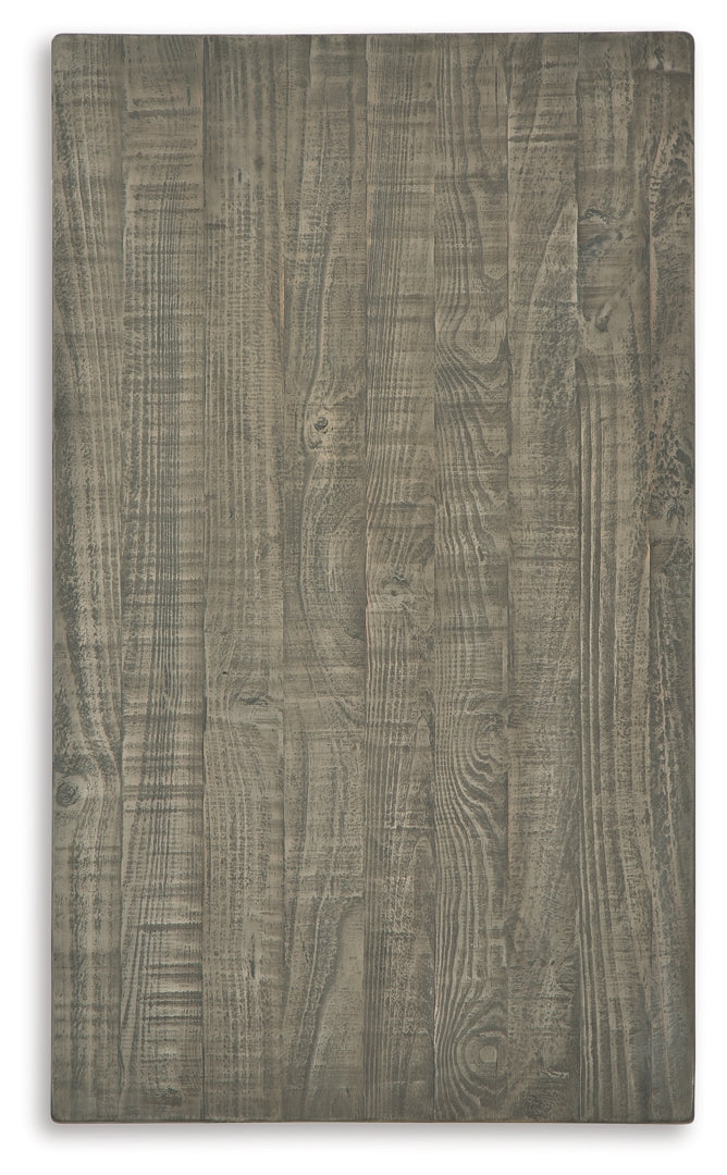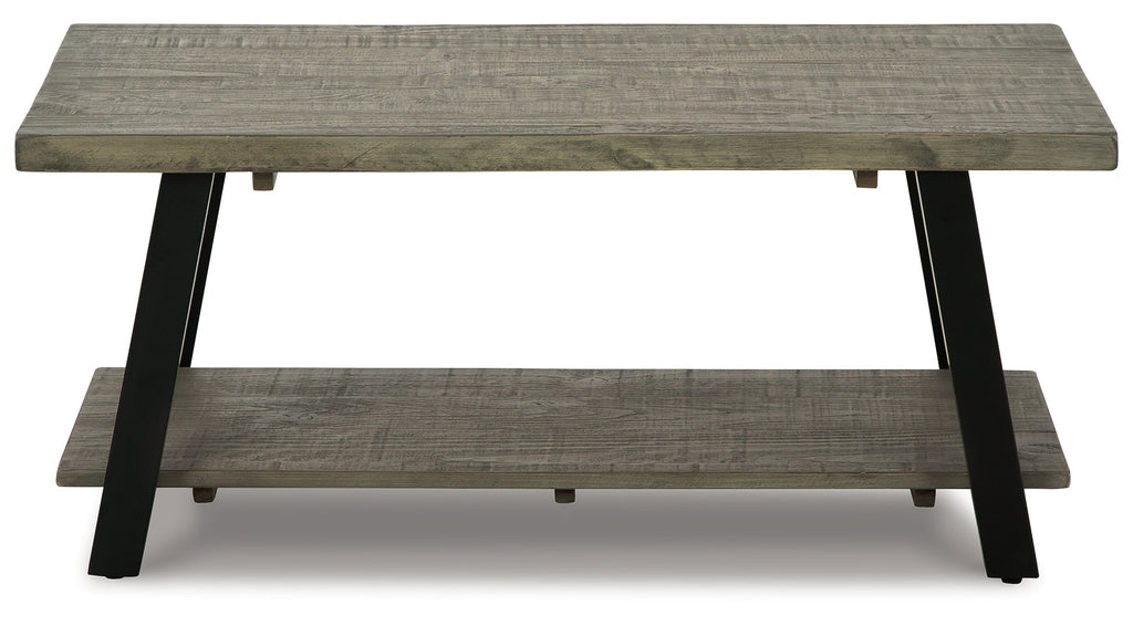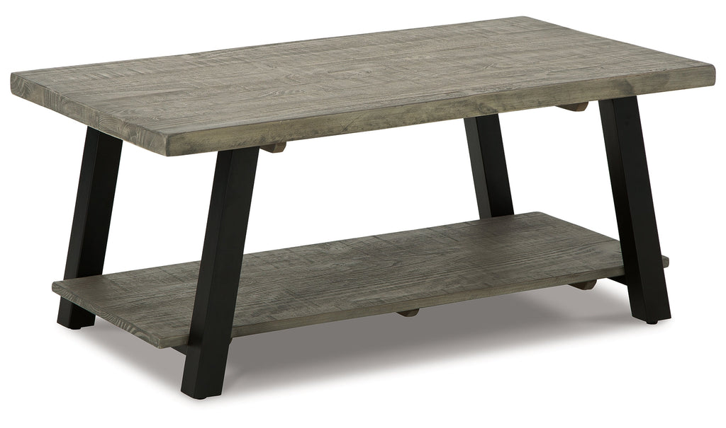 This rectangular coffee table is an achievement in urban contemporary styling. Its ultra-cool design pairs a thick slab-style tabletop and an open lower shelf of solid pine wood with linear metal legs. A weathered gray finish keeps the aesthetic warm and inviting.