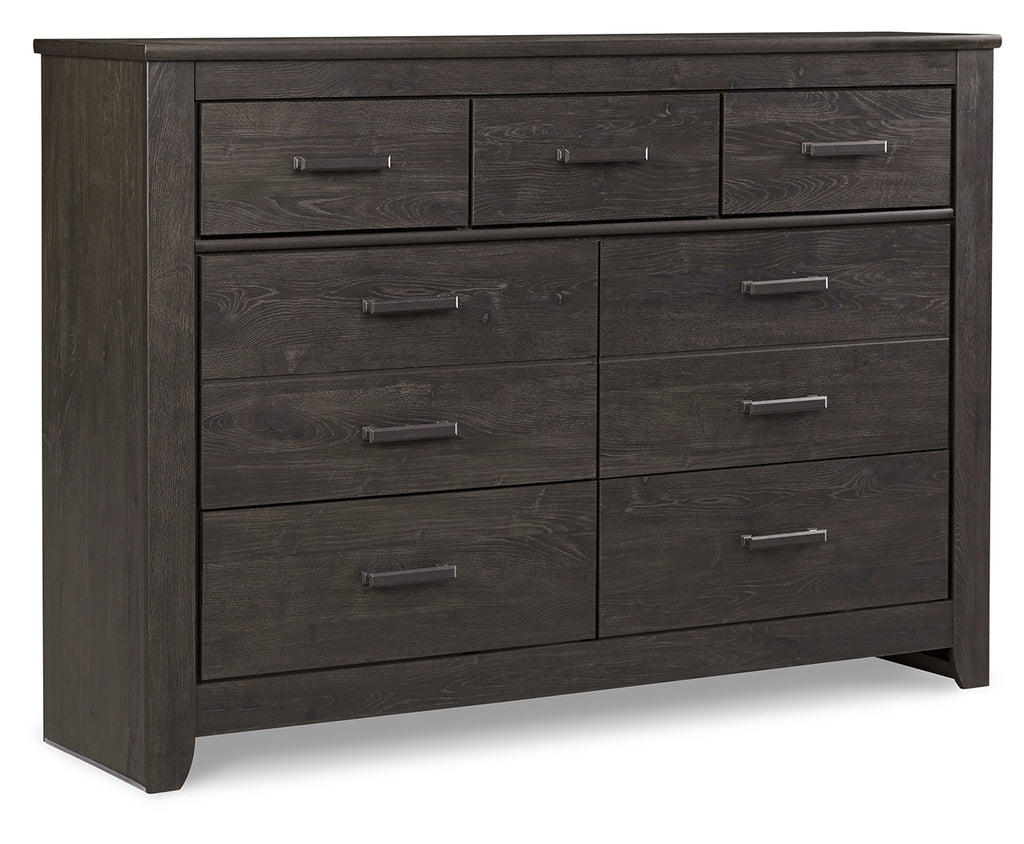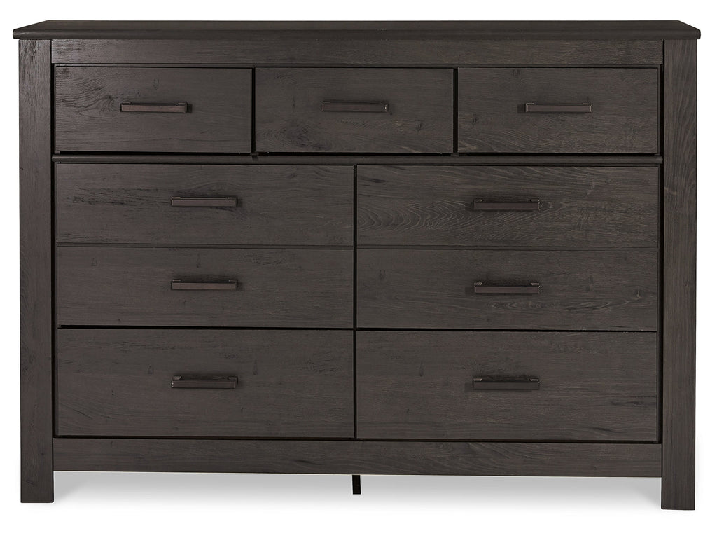 Priced to entice and styled to impress, this dresser and mirror set makes the most of a clean-lined, contemporary profile. With three drawer sizes scaled to meet your needs, the design merges cool form and practical function. Replicated oak grain effect gives the modern, gray finish warmth and character. Large linear pulls are a sleek touch.