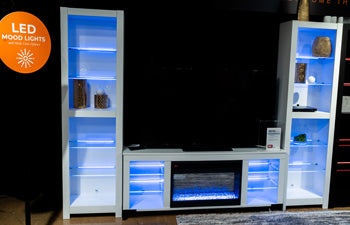 - Fireplace insert and shelves feature color and brightness controlled LED lighting
