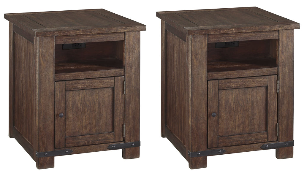 Rustic beauty and functionality ensue with this 2-piece rectangular end table set. Its farmhouse style garners attention with distressed rustic finish and black metal accents. You'll love the extra room in the cubby and lower cabinet for stashing items. What's more, a convenient AC power supply with two USB charging ports is located in the top of the cubby—perfect for keeping your cell phone or laptop charged without having to get up from your seat.