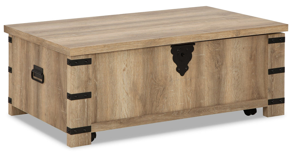 This coffee table reinvents yesterday’s style with casually modern flair. Its replicated natural oak grain is warm and inviting, while metal accents deliver a rustic, mixed-material edge. This laid-back luxe piece is further elevated by the lift-top design, providing surface space for daytime work or movie-night snacks.