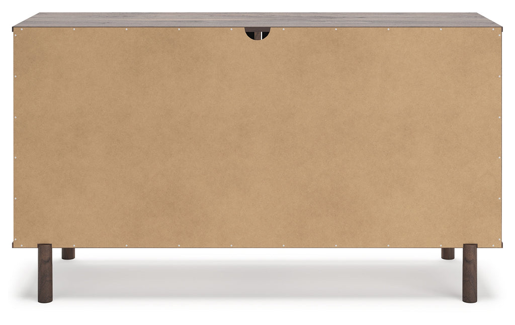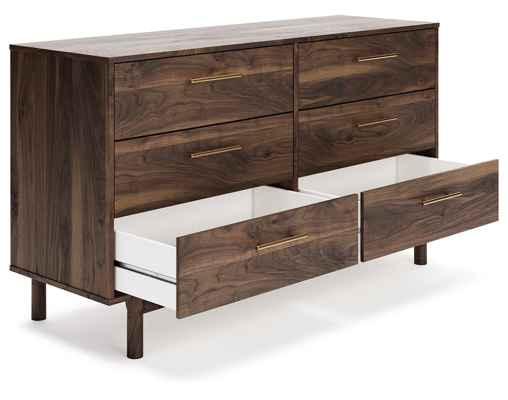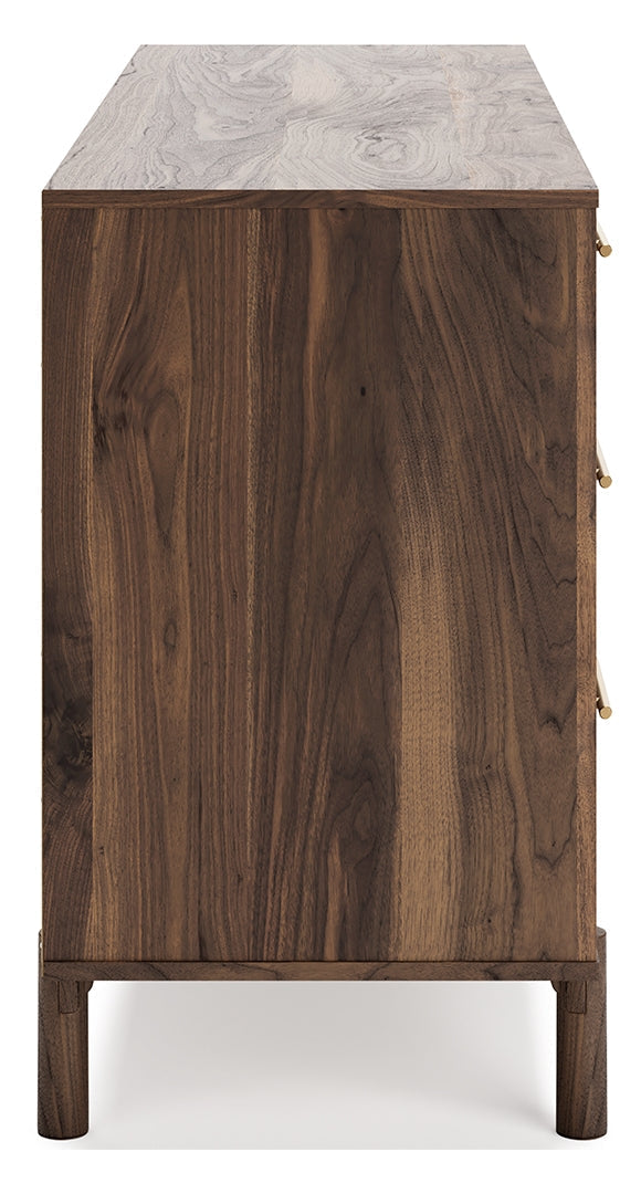 At the intersection of industrial cool and chic sophistication, you’ll find this dresser. With a rich brown finish over replicated walnut wood grain, paired with burnished goldtone handles, it offers an authentic touch that plays well any way you style it. Simple and elegant in its design, this piece keeps your home decor grounded while elevating your modern style.