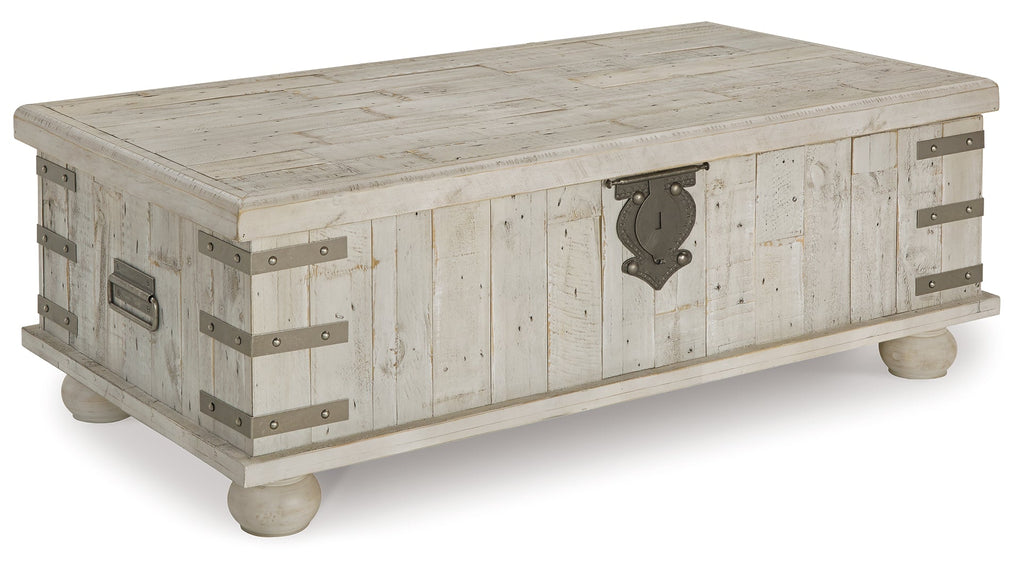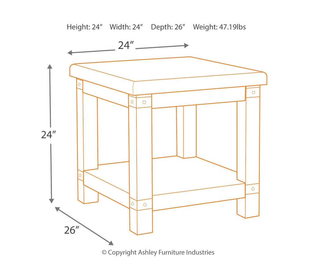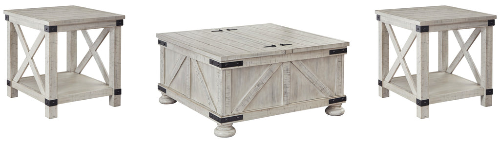 Double up on form and function with this accent table set. The versatile coffee table has secret storage under its dual-lid tabletop. Sporting a distressed whitewash finish, the coordinating end table is rustic farmhouse living at its best. Crossbuck styling adds striking flair. Metal industrial brackets incorporate an industrial twist.