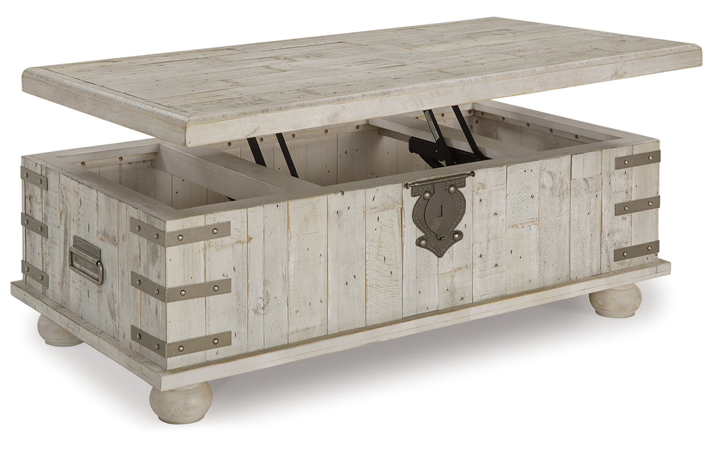 Unlock a quaint touch of farmhouse style and convenience in your living area with this lift top coffee table. Its design is inspired by the rugged looks of an antique storage trunk. Metal keyhole and bracket accents with rivets, a planked effect and large recessed bun feet dress up this charming piece. The distressed light gray finish enhances the reclaimed wood's natural grain, which delivers a naturally aged feel. You’ll love its generous scale, offering a roomy top that's ideal for displaying accents and more. Lift the top and enjoy the accommodating work or dining surface. Under the lift top, there's a fully finished storage area—deeply spacious for organization.