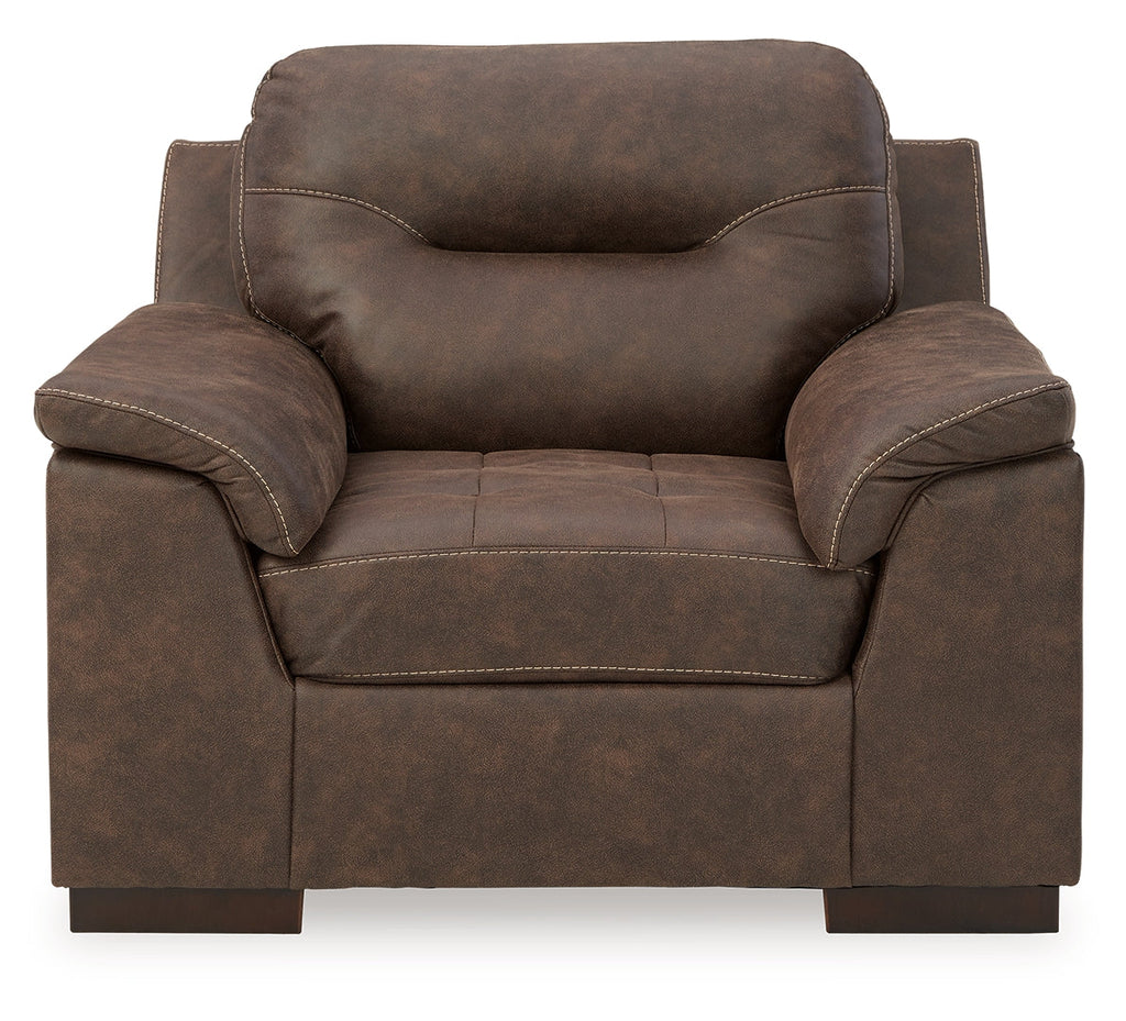 If you love the idea of a luxe look that won't break the bank, make yourself comfortable with this alluring walnut brown chair. Designed to look like the real thing, it's wrapped in a practical faux leather loaded with natural tonal variation and a soft hand feel. Appealing to a contemporary taste, its jumbo stitching, tufted styling and pillow top armrests are indulgently comfortable, with a streamlined look that tops off the high-end aesthetic made for everyday living.