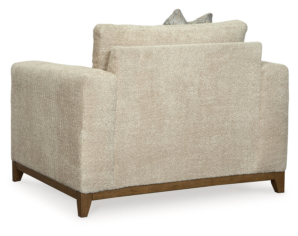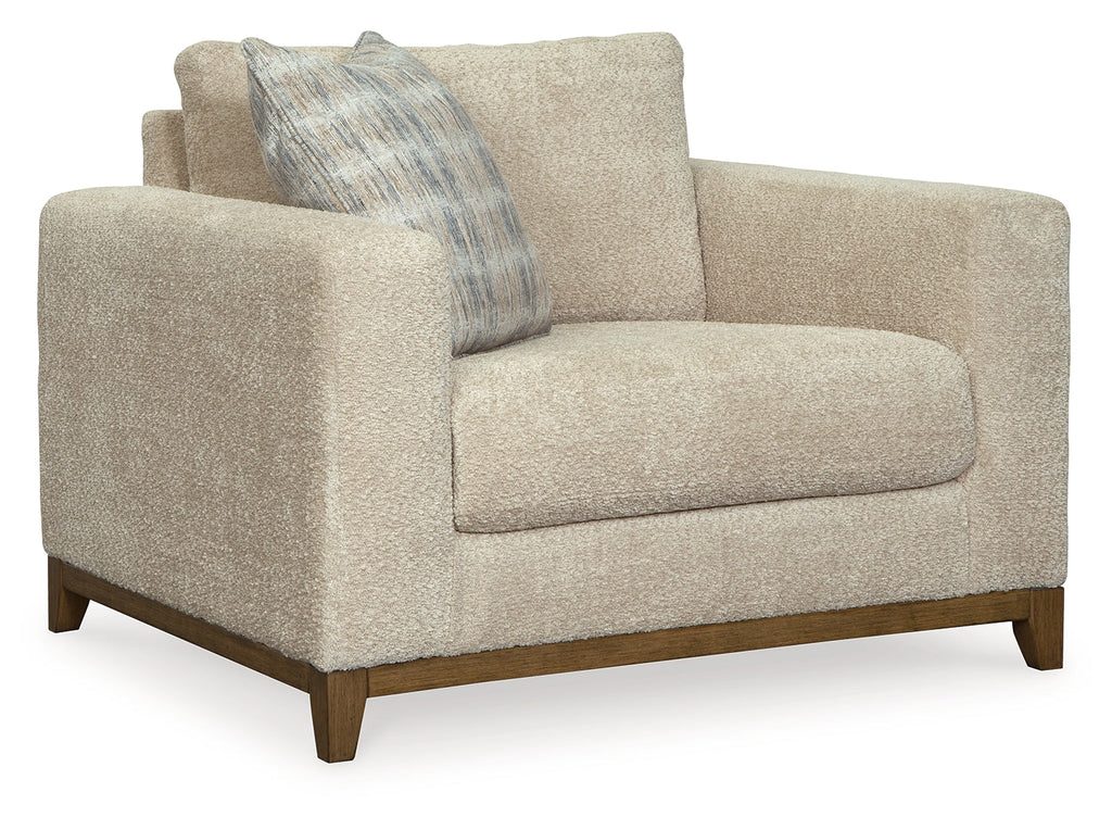 Serene style with a modern sensibility. Delight in the cozy, versatile embrace of this oversized chair. It takes an on-trend approach to irresistible texture and natural beauty, showcasing soft upholstery accented with a transitional wood trim. As refined as it is laid back, the chair also keeps comfort a priority with a plush, thick seat cushion.