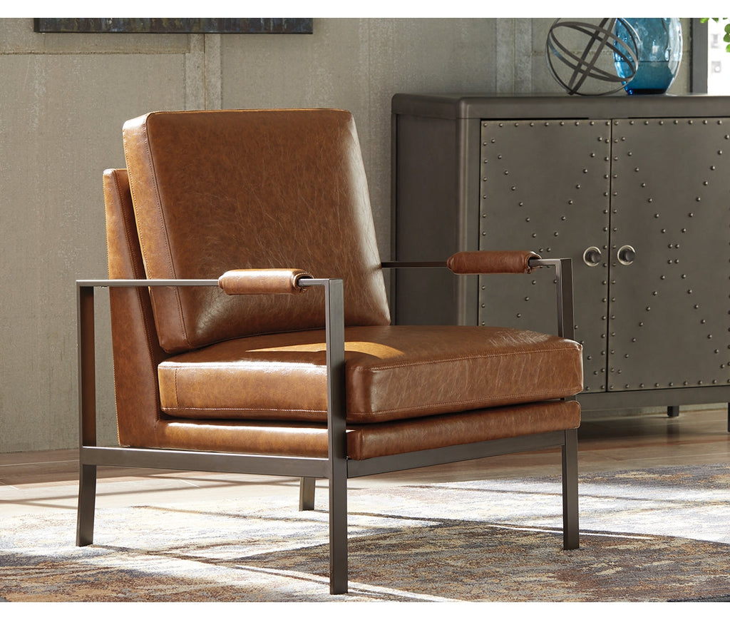 Find the perfect balance of high style and plush comfort with this accent chair. Ultra-linear metal frame and box seat cushion styling are sure to appeal to contemporary tastes. Weathered faux leather in a light brown tone give this cool chair a sense of warmth.