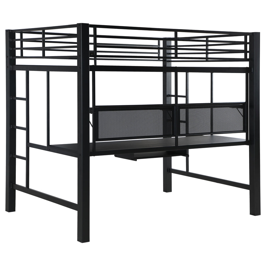 For workaholics who never stop thinking about their next great innovation, this workstation loft bed is a godsend. Combine work and sleep in a modern way with demonstrable sophistication. Metal loft bed is finished in black. Below the bed is work area that includes desk with keyboard tray and storage shelf. A delightfully contemporary addition to any living space, particularly a loft.
