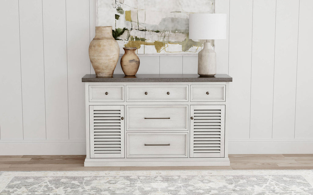 Modern farmhouse character infuses a louvered sideboard to create stylish storage