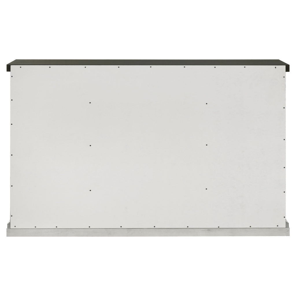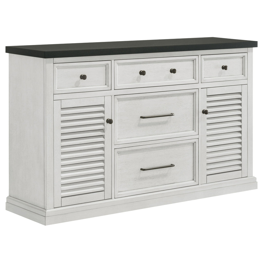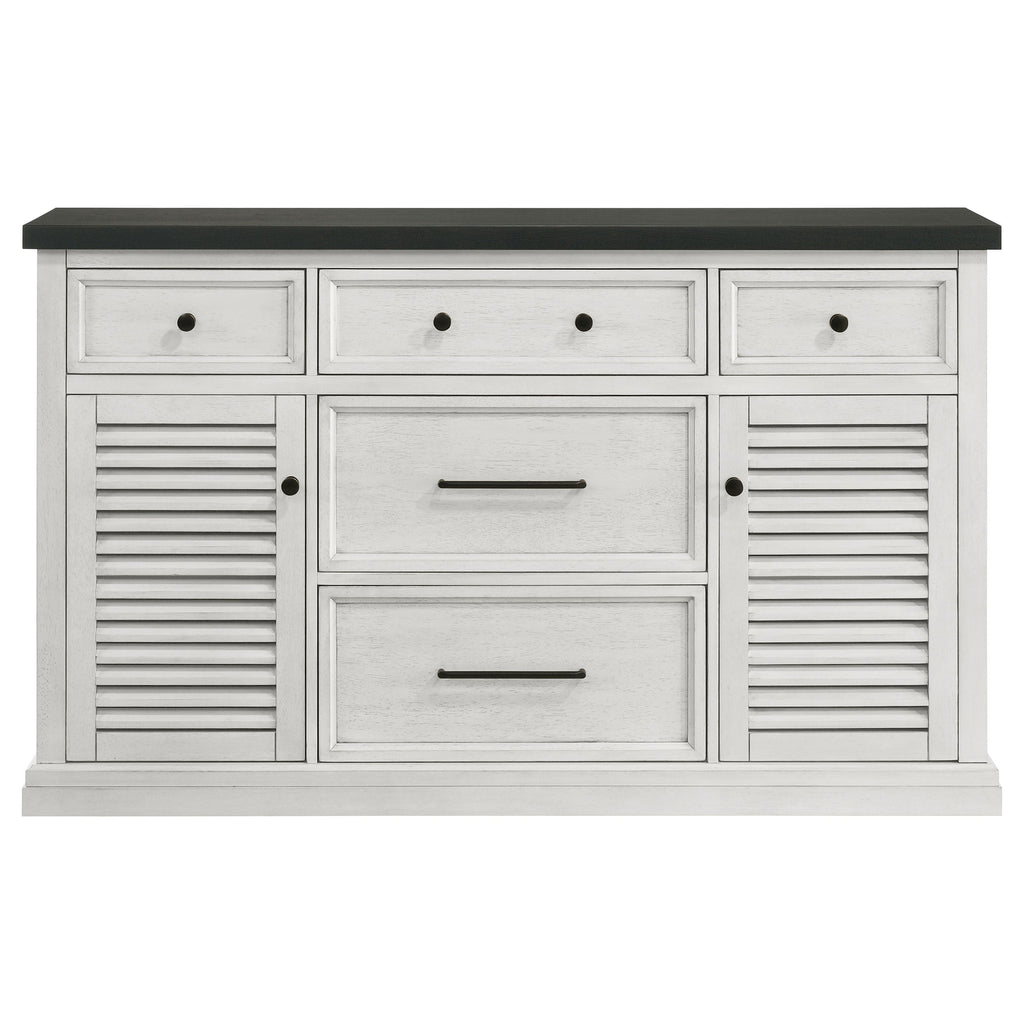 Evoke a comfortable and welcoming modern farmhouse ambiance with a charming five-drawer sideboard added to your dining room. The versatile piece offers plentiful storage with three smaller top drawers, all with felt lining, that are perfect for accessories and linens. Two larger lower drawers are also lined with felt and make a perfect spot for serve ware and other dining essentials. On each side, cabinets add even more space for storage, with louvered doors that deliver a perfect hint of rustic character. The sideboard features a charming two-tone finish complete with a charcoal sand-through finish on top and a vintage chalk white finish on the base that create a stylish combination.