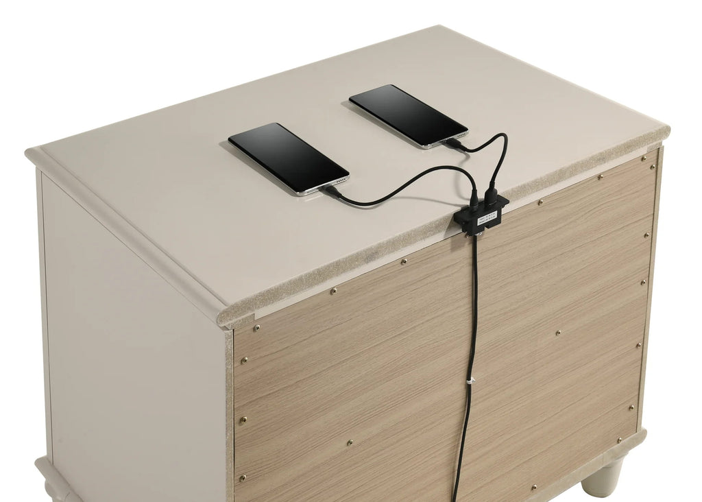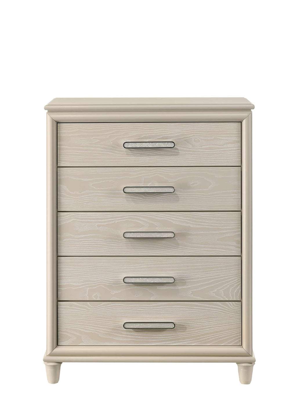 The collection stands out with its unique diagonal grain embossed panels found on the drawer fronts, providing a sharp, modern texture that contrasts beautifully against the decorative black-silver fiberglass accents on the front frames. Practicality is woven into every piece; the dresser includes a built-in jewelry box for organized storage, while the nightstand serves as a convenient charging station with integrated USB and Type C ports. Every drawer is mounted on smooth ball-bearing glides for effortless daily use. The suite is supported by a sophisticated combination of acrylic bun-feet at the front and sturdy metal legs at the back, giving the furniture a light, floating silhouette that complements its modern aesthetic. Whether you choose the 4-piece or 5-piece configuration, this set delivers a perfect blend of high-end style and everyday convenience.