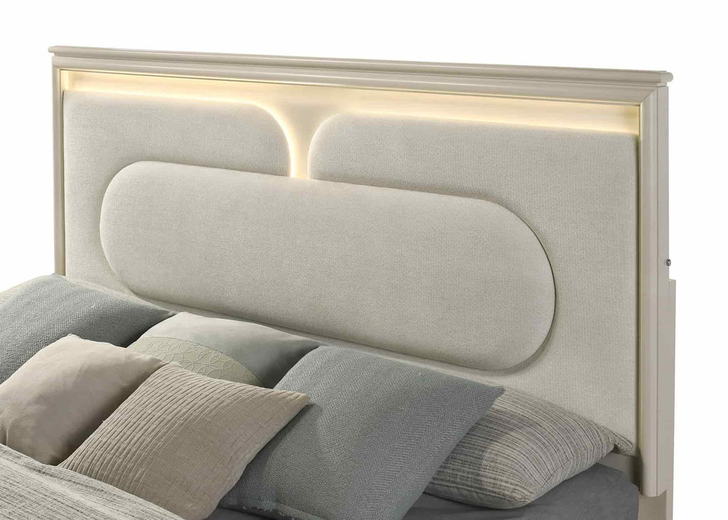 Bring a breath of fresh, metallic sophistication to your home with the B6700 Amiri bedroom collection in a striking Silver Ice finish. This ensemble is anchored by a majestic queen bed or king bed featuring a soft grey fabric upholstered headboard that offers a plush surface for relaxation. The architectural design is highlighted by integrated LED lighting in both the headboard and the mirror, creating a radiant glow that enhances the room’s contemporary atmosphere.