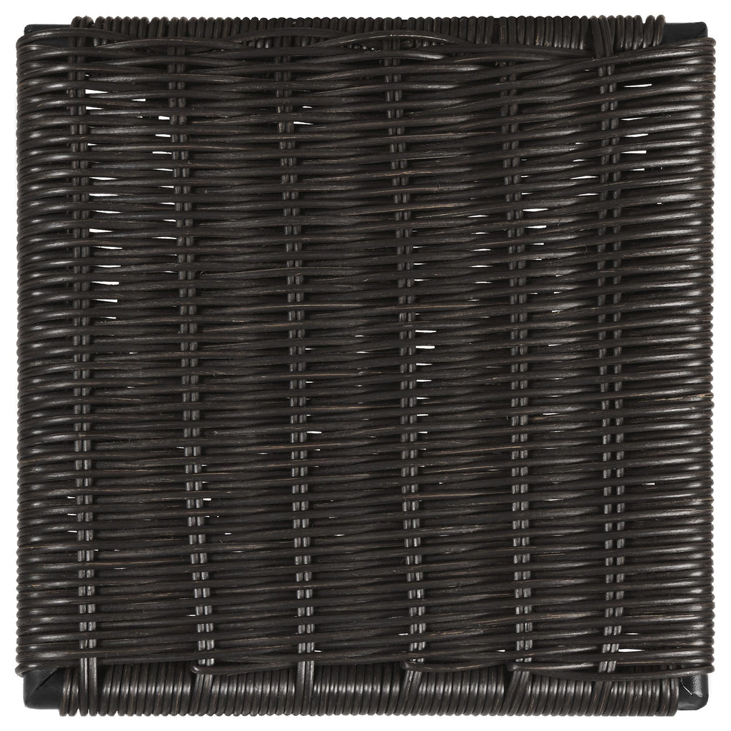 Complement with a tactile touch: a brown handwoven faux rattan seat on a black metal-framed transitional dining chair