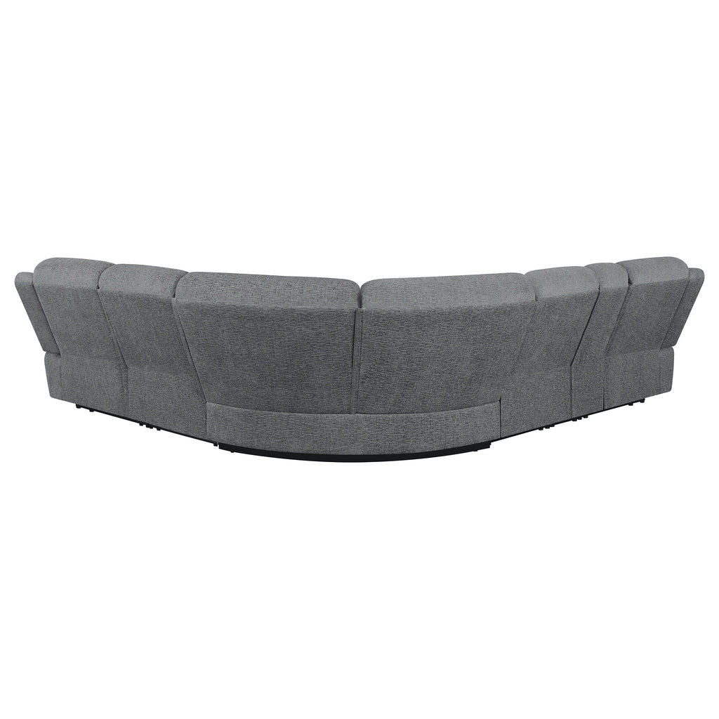 Six-piece modular power sectional upholstered in charcoal performance chenille