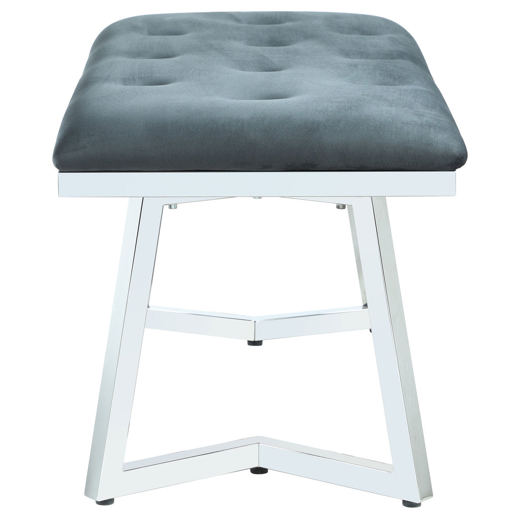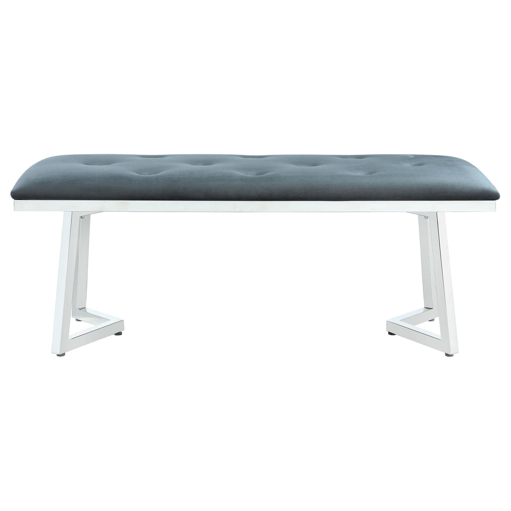 Sleek with minimal clean lines, this long bench features a button tufted cushion for sitting comfortably. The upholstery is a soft velvet, for an extra luxurious feel. The base offers a glamorous flair to a home with its polished chrome finish. Beneath the finish is a sturdy and supportive stainless steel frame with two braces with an angular designed silhouette. Pull this bench up to a dining room table for extra seating.