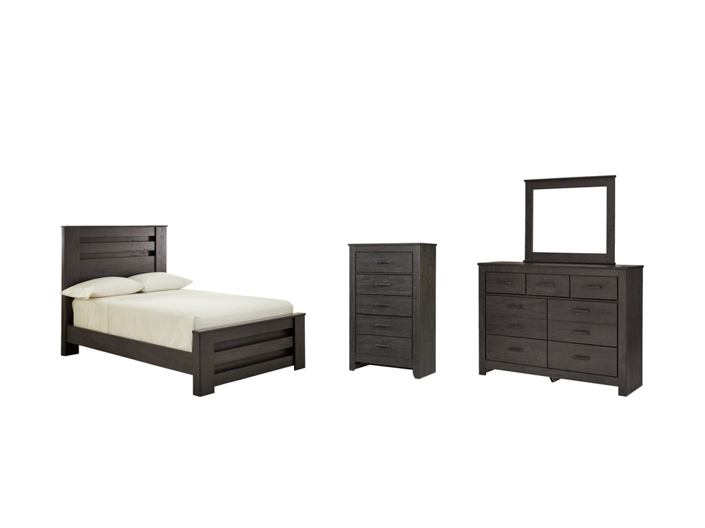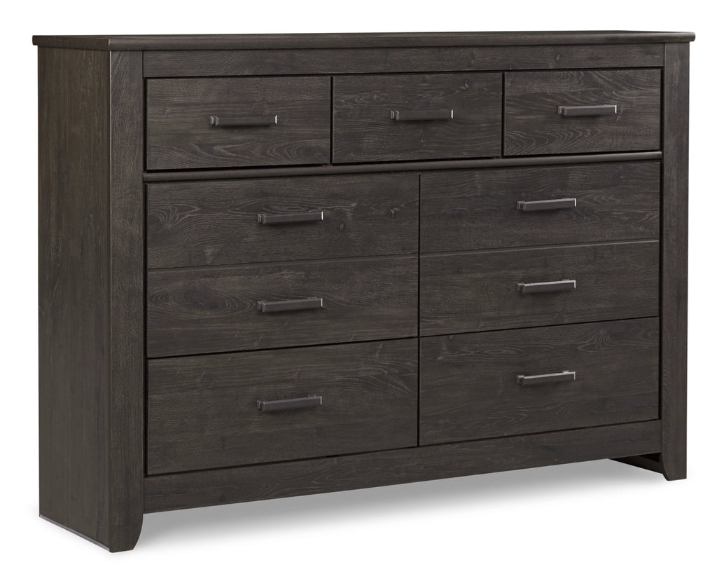 Priced to entice and styled to impress, this 4-piece bedroom set is urban sophistication with a decidedly relaxed air. It’s got the crisp, clean lines of a contemporary piece, but with an earthy element. Deep, horizontal grooves infuse depth and dimension, a replicated oak grain effect gives the charcoal gray finish warmth and character. Mattress and foundation/box spring sold separately.