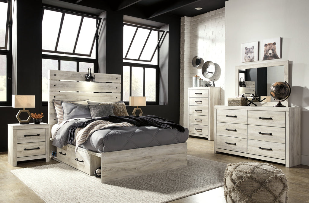 Whether you lean towards modern loft or modern farmhouse, this panel storage bed and dresser tip the balance in your favor. The wispy whitewash finish enhances the style without covering the grain for that weathered look you just can’t get enough of. Love to read in bed? You’re sure to find the retro-chic light sconce and USB plug-ins on the open-slat style headboard to be a totally bright idea while the elongated metal drawer pulls on the dresser and underbed drawers really elevate the aesthetic. What a delightful take on rustic industrial style.