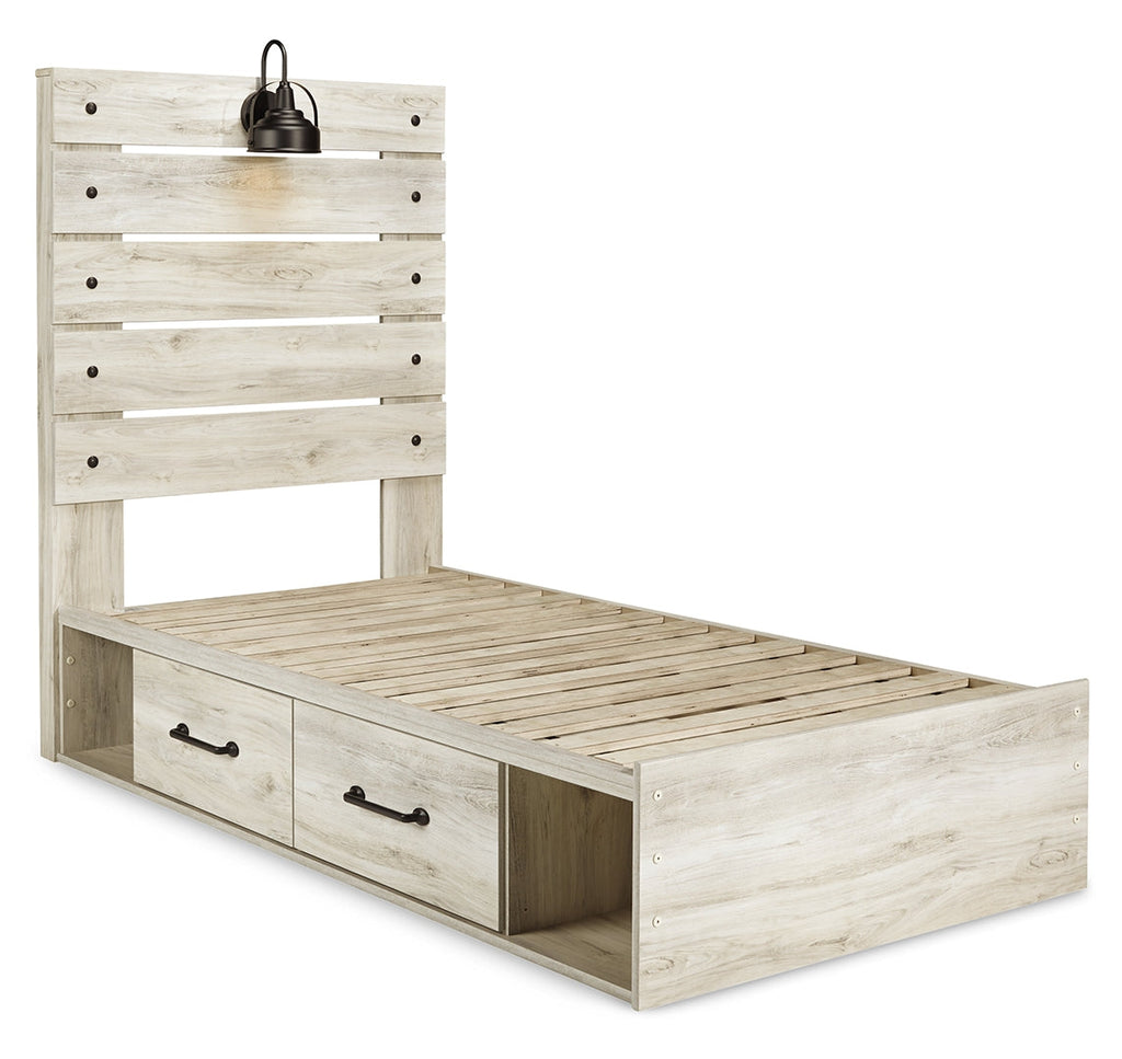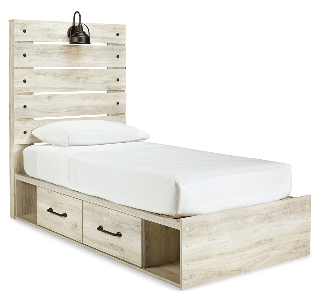 Whether you lean towards modern loft or modern farmhouse, this panel storage bed and dresser tip the balance in your favor. The wispy whitewash finish enhances the style without covering the grain for that weathered look you just can’t get enough of. Love to read in bed? You’re sure to find the retro-chic light sconces and USB plug-ins on the open-slat style headboard to be a totally bright idea while the elongated metal drawer pulls on the dresser and underbed drawers really elevate the aesthetic. What a delightful take on rustic industrial style.