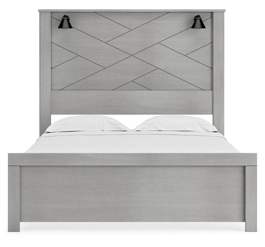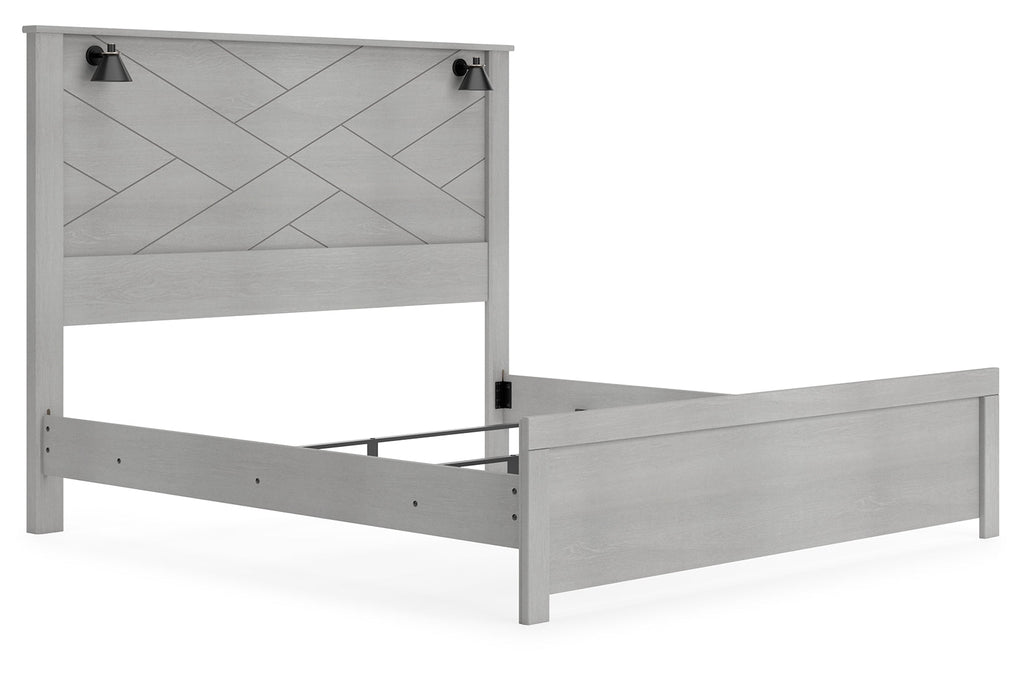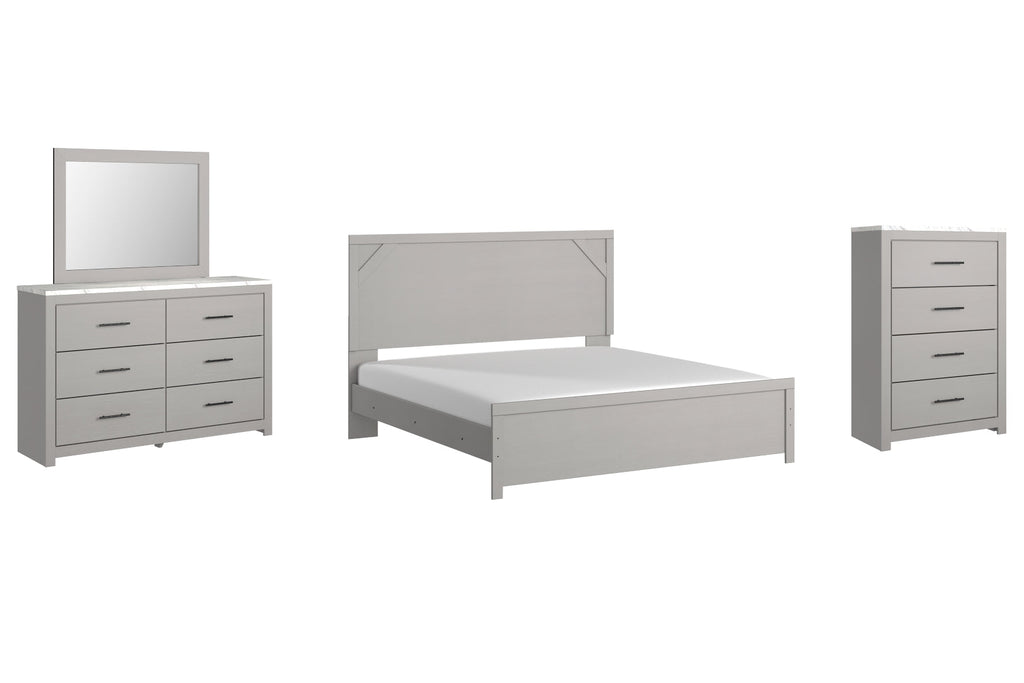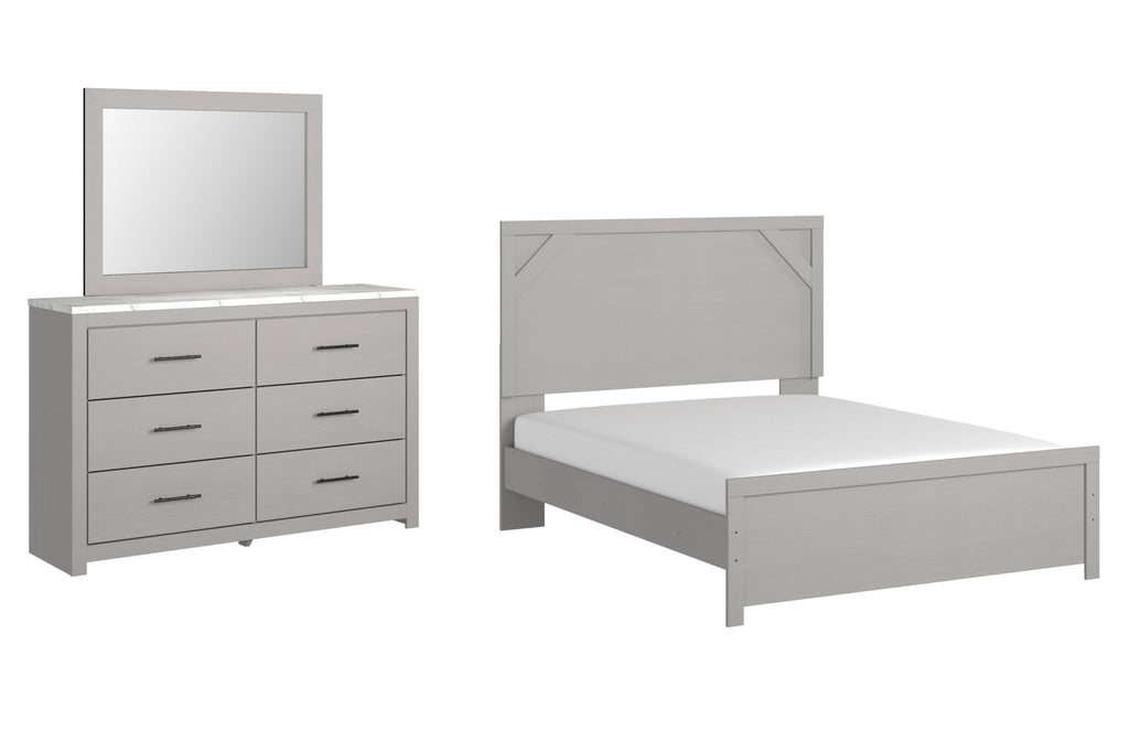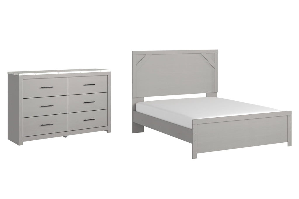 Cool, clean and casually modern. This bedroom set’s wispy dove gray finish sets the tone for your calming sanctuary. Framed elements and cross-brace accents add dimension and authenticity to the bed’s simply stunning profile. The dresser's large linear pulls and smooth-gliding drawers neatly accommodate your wardrobe and bedside storage needs.