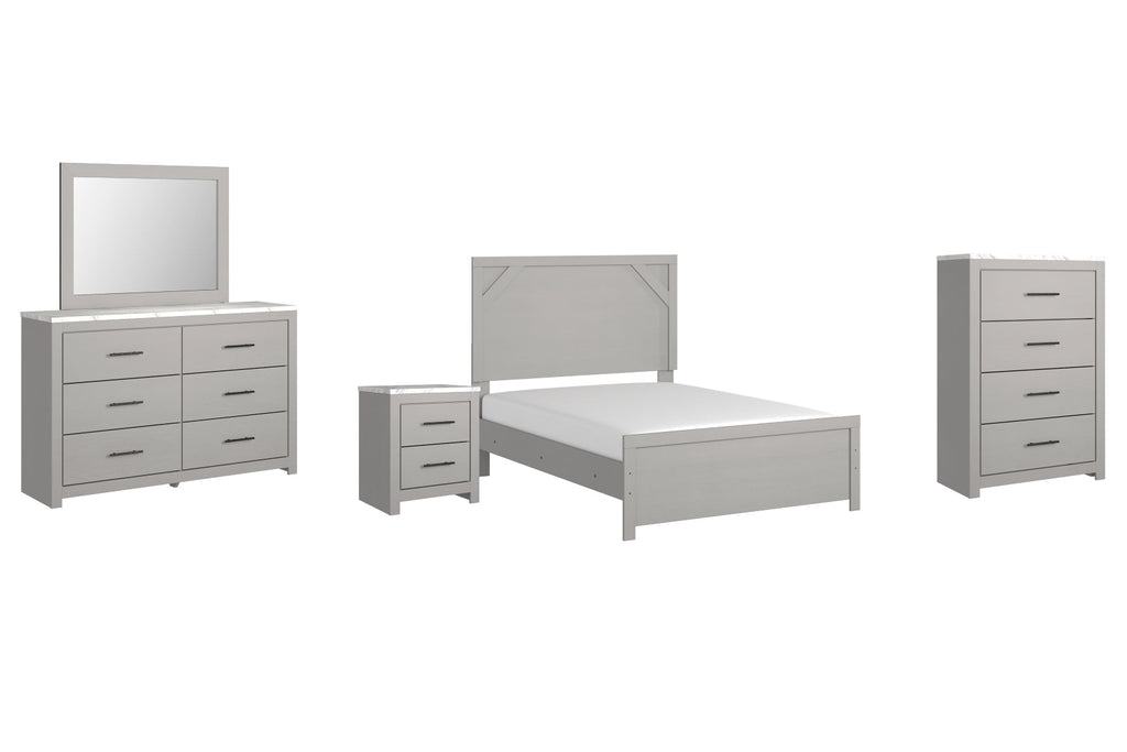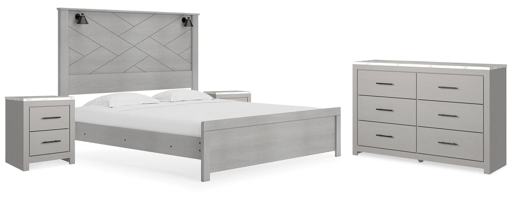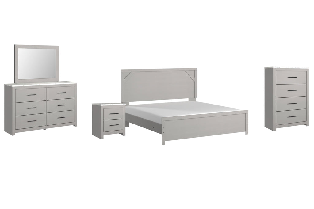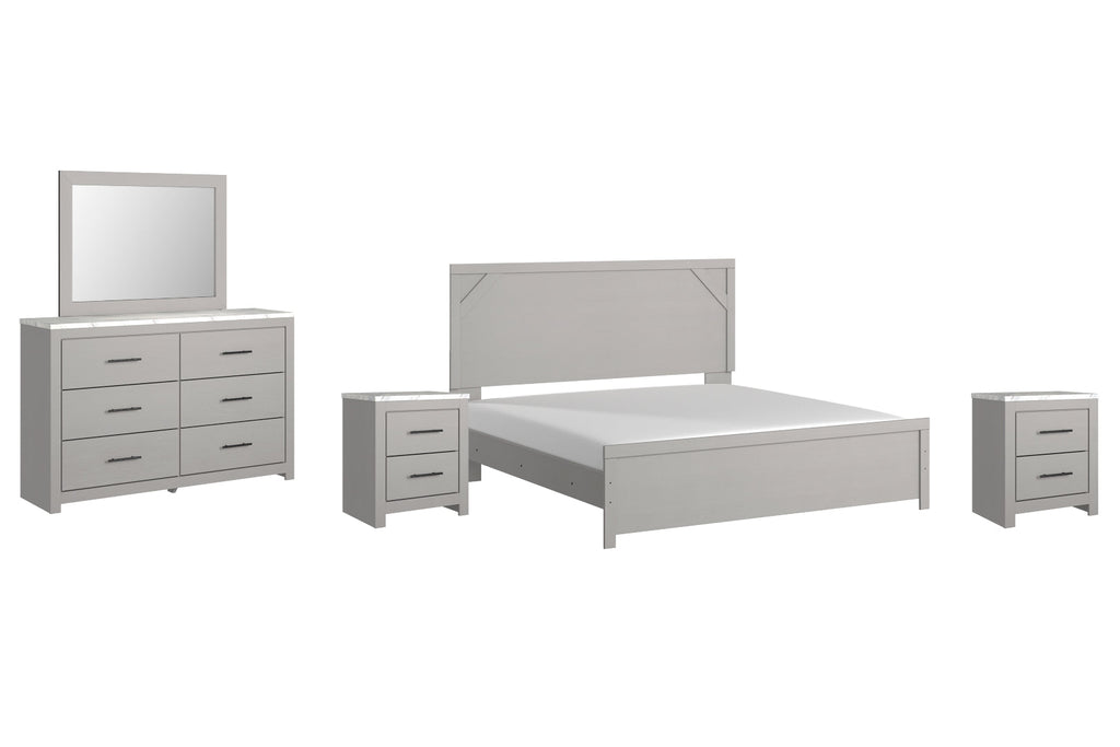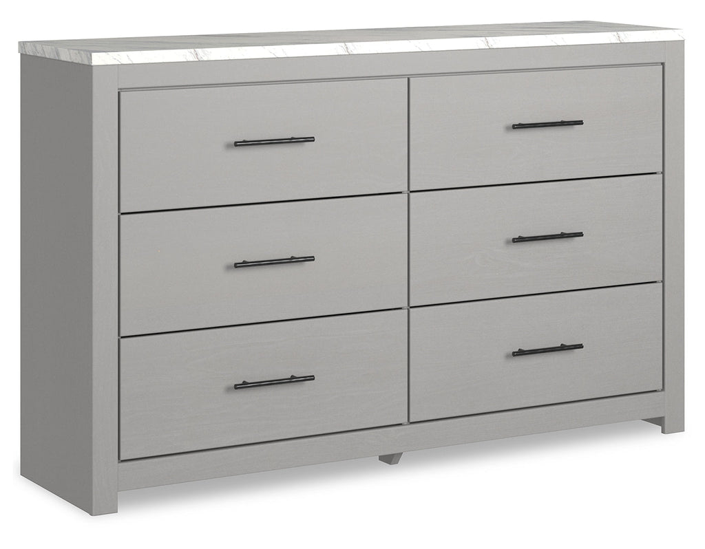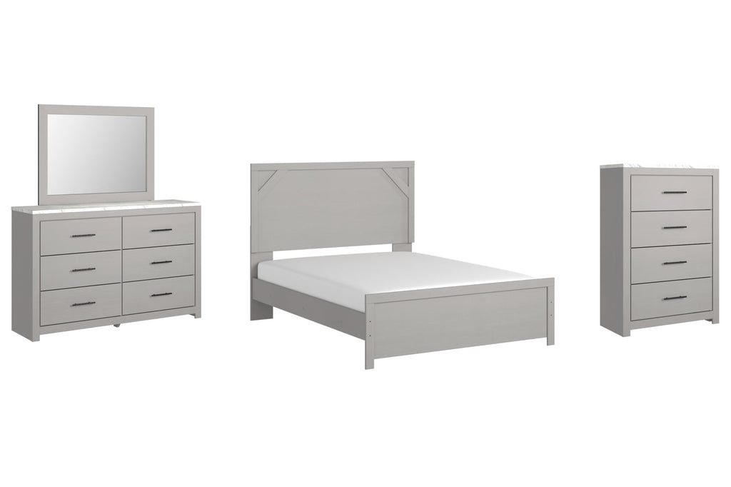 Cool, clean and casually modern. This bedroom set’s wispy dove gray finish sets the tone for your calming sanctuary. Framed elements and cross-brace accents add dimension and authenticity to the bed’s simply stunning profile. The dresser's large linear pulls and smooth-gliding drawers neatly accommodate your wardrobe and bedside storage needs.
