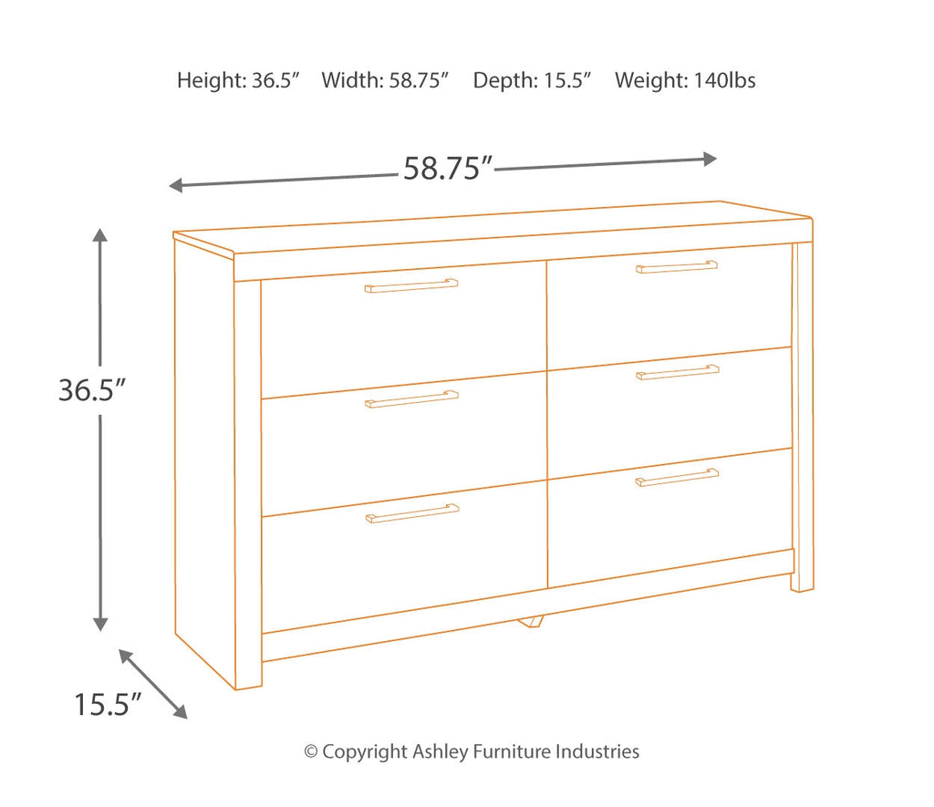 Walk the line between industrial and farmhouse styles with the modern heft of this panel bed with storage and dresser. A rustic butcher block finish is tastefully roughhewn with appealing color variations and imperfections. The substantial bed is hearty and robust with ample storage in the footboard while the dresser provides roomy drawers with metal pulls in an antiqued gunmetal finish to complete this eclectic look.