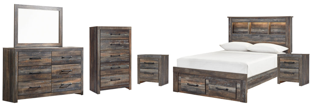 - Includes bookcase headboard, footboard, 2 underbed storage units, rails and wood roll slats