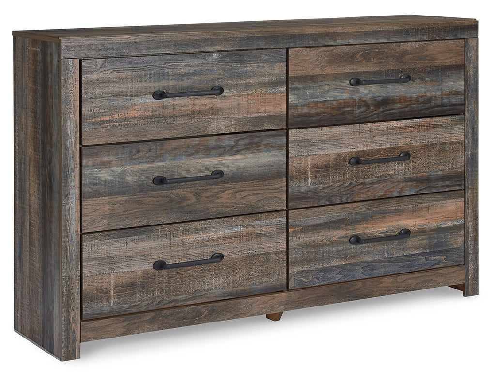 This full-size panel bed, mirror, dresser and two nightstands is a refined take on barn board beauty. Its complex, replicated wood grain showcases hints of burnt orange and teal tones for a sense of weatherworn authenticity. Love to read in bed? You’re sure to find the pair of retro-chic light sconces and USB plug-ins on the open-slat style headboard such a bright idea. The dresser and nightstand with smooth-gliding drawers lined with faux linen laminate and industrial dark-tone hardware complete this rustic and industrial style bedroom. Mattress and foundation/box spring available, sold separately.