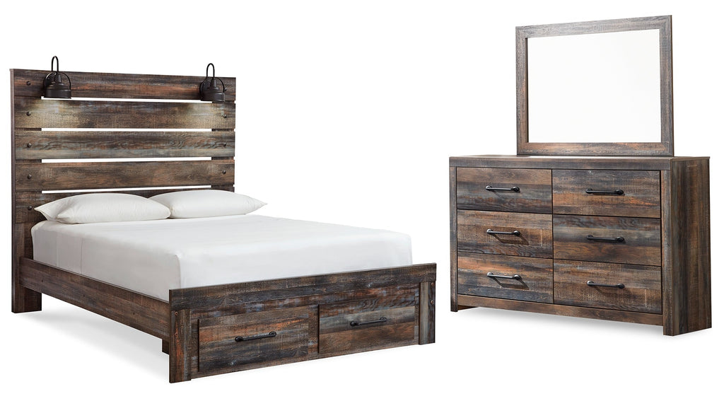 When merged in just the right way, rustic and industrial styles can make one happy marriage. Case in point: this bedroom set with bookcase bed with underbed storage, dresser/mirror and chest. A refined take on barn board beauty, its complex, replicated wood grain showcases hints of burnt orange and teal tones for a sense of weatherworn authenticity. Love to read in bed? Three open cubbies lined with a dimming LED light strip keep bedtime reads top of mind. Underneath the bed: smooth-gliding drawers and open cubbies that accommodate casually cool storage bins. Elongated metal drawer pulls elevate the aesthetic.