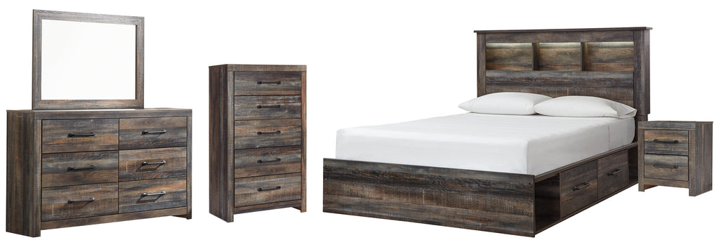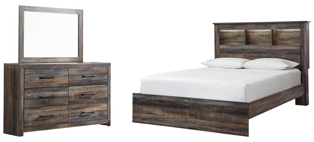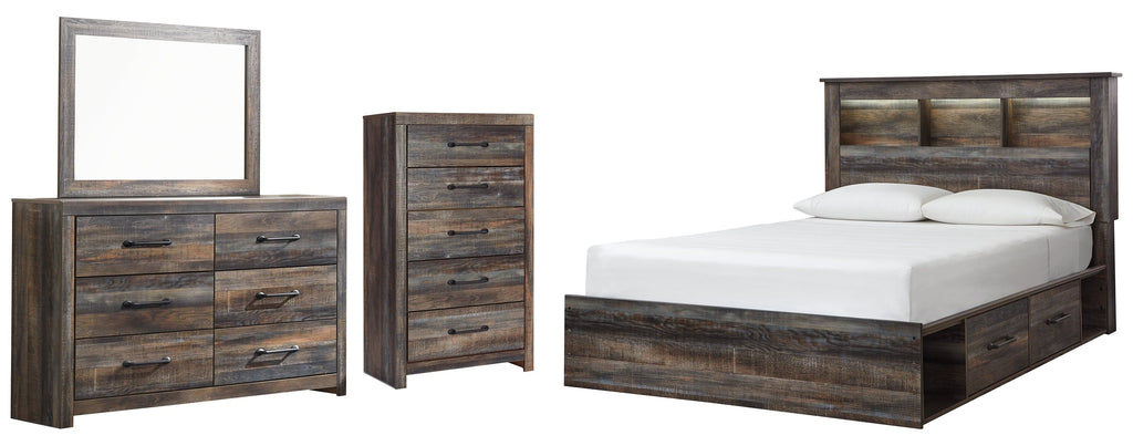 Drystan Queen Bookcase Bed with 4 Storage Drawers with Mirrored Dresser and Chest